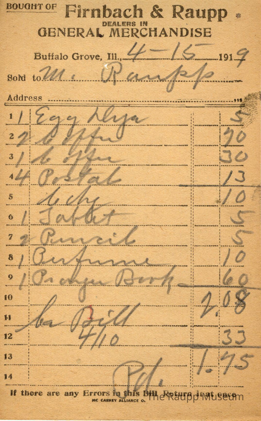 One (1) Firnbach and Raupp store reciept from April 15, 1919. Receipt is rectangular with black printed text and written notes in pencil. The receipt is for M. Raupp, who bought 1 egg dozen (?) for $0.05, 2 coffee for $0.70 1 coffee for $0.30, 4 postal for $0.13, (?) for $0.10, 1 (?) for $0.05, 2 pencils for $0.05, 1 perfume for $0.10, and 1 prayer book for $0.60. Bill total was $2.08, but $0.33 was taken off from a bill on 4/10 for a final total of $1.75. There's a red "1" stamp at the bottom with the bill marked as paid.