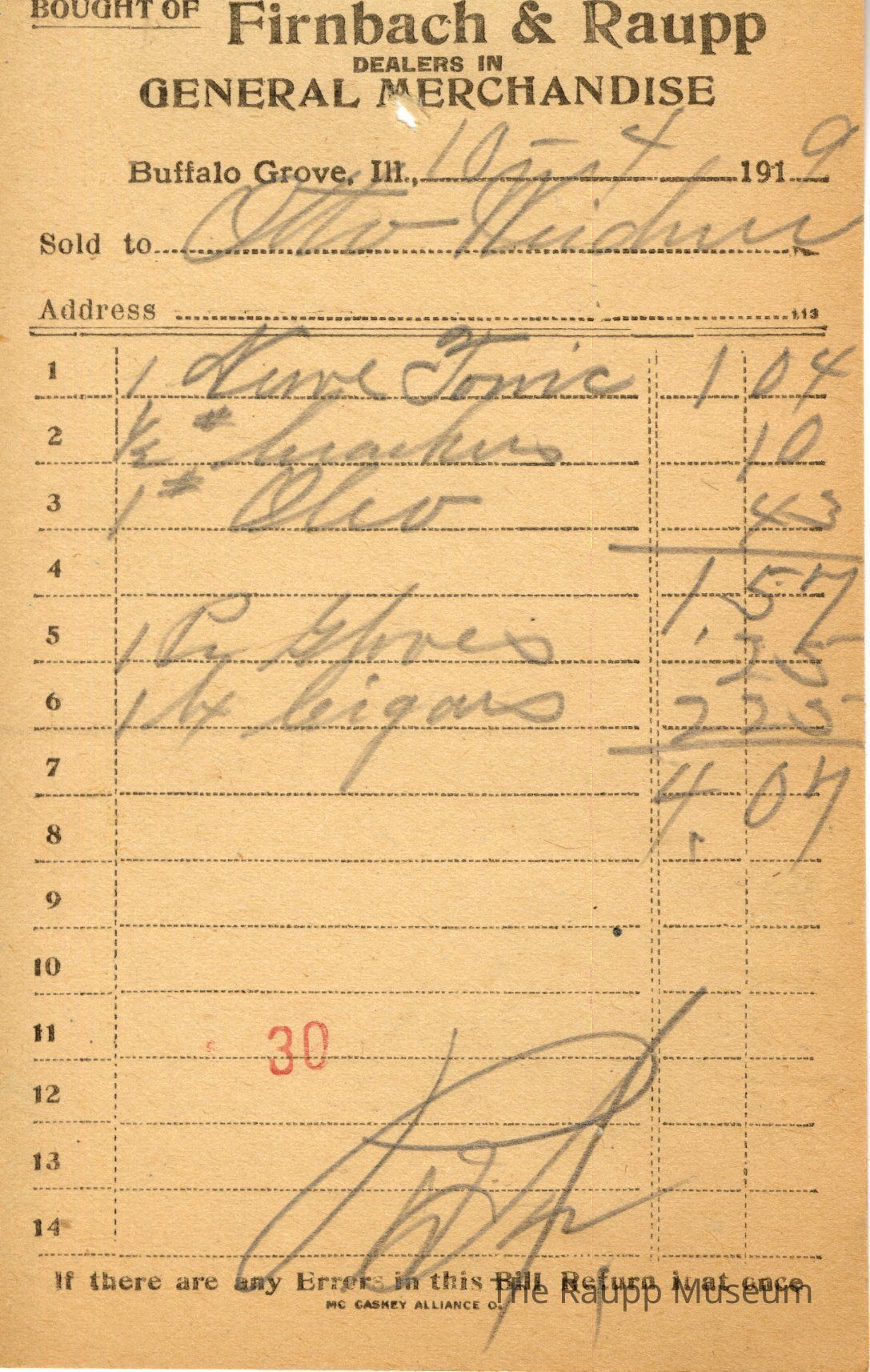 One (1) Firnbach and Raupp store receipt from October 4, 1919. Receipt is rectangular with black printed text and written notes in pencil. The receipt is for Otto Weidner, who bought one Nerve Towie (?) for $1.04, one-half pound of crackers for $0.10, one pound of oleo for $0.43, one pair of gloves for $0.25, and one box of cigars for $2.25. The bill total is $4.07 and the receipt is marked as paid. A red stamp of 30 is located towards the bottom of the page. The text from top to bottom is: BOUGHT OF Firnbach & Raupp; DEALERS IN GENERAL MERCHANDISE; Buffalo Grove, Ill.; Sold to; Address; If there are any Errors in this Bill Return It at once; MC CASKEY ALLIANCE O.Archive Details