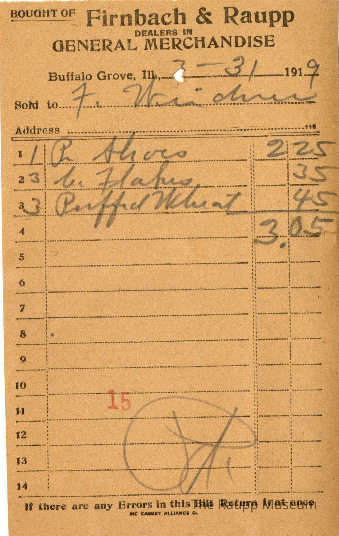 One (1) Firnbach & Raupp store receipt from March 31, 1919. The receipt is rectangular with black printed ink and handwritten notes in pencil. The receipt is for F. Weidner, who bought 1 pair of shoes for $2.25, 3 quantities of Flakes for $0.35, and 3 puffed wheat for $0.45. Bill total is $3.05. There is a red stamp of 15 close to the bottom, along with "Pd." to indicate that it was paid.
