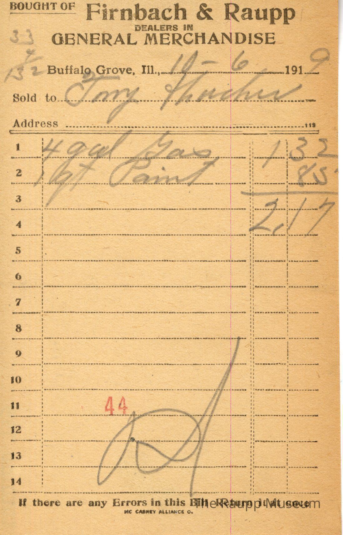One (1) Firnbach and Raupp store receipt from October 6, 1919. Receipt is rectangular with black printed text and written notes in pencil. The receipt is for Tony Horcher, who bought four gallons of gas for $1.32 and one quart of paint for $0.85. The bill total is $2.17 and the receipt is marked as paid. A red stamp of 44 is located towards the bottom of the page. The text from top to bottom is: BOUGHT OF Firnbach & Raupp; DEALERS IN GENERAL MERCHANDISE; Buffalo Grove, Ill.; Sold to; Address; If there are any Errors in this Bill Return It at once; MC CASKEY ALLIANCE O.Archive Details