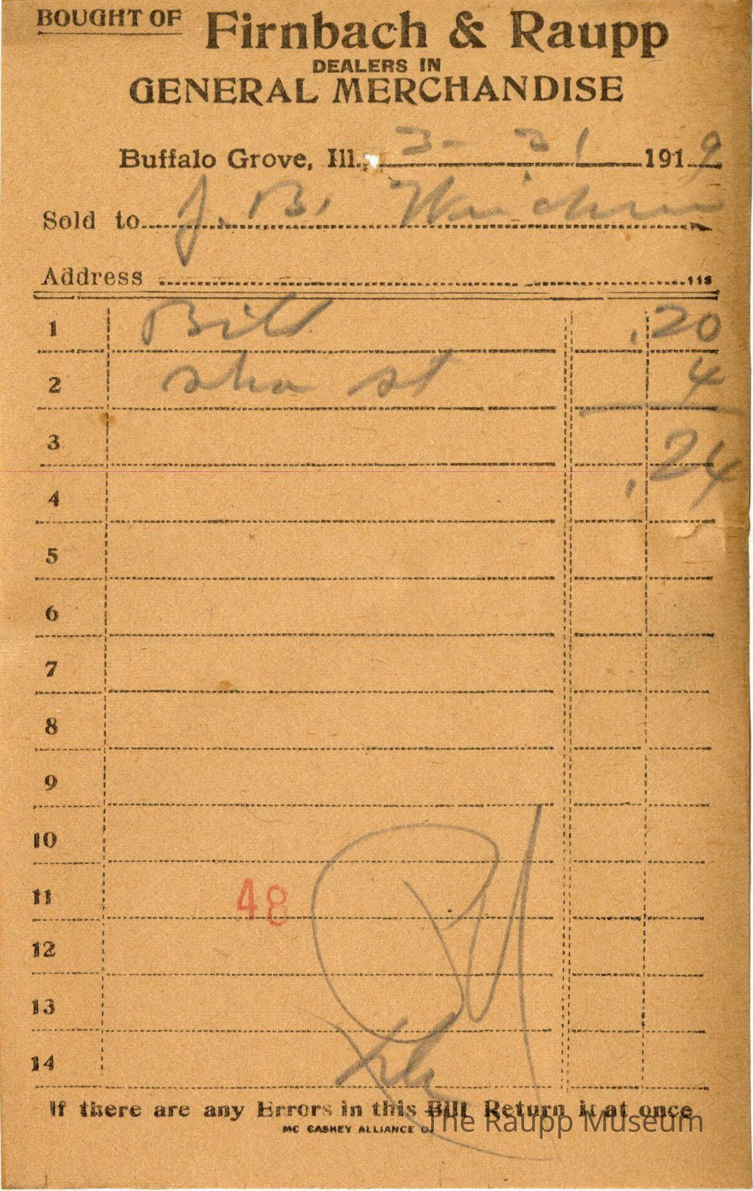 The black printed text is as follows, from top to bottom: Bought of Firnbach & Raupp; Dealers in GENERAL MERCHANDISE; Buffalo Gove. Ill, 191; Sold to; If there are any errors in this Bill Return it at once; MC CASKEY ALLIANCE O.Archive Details