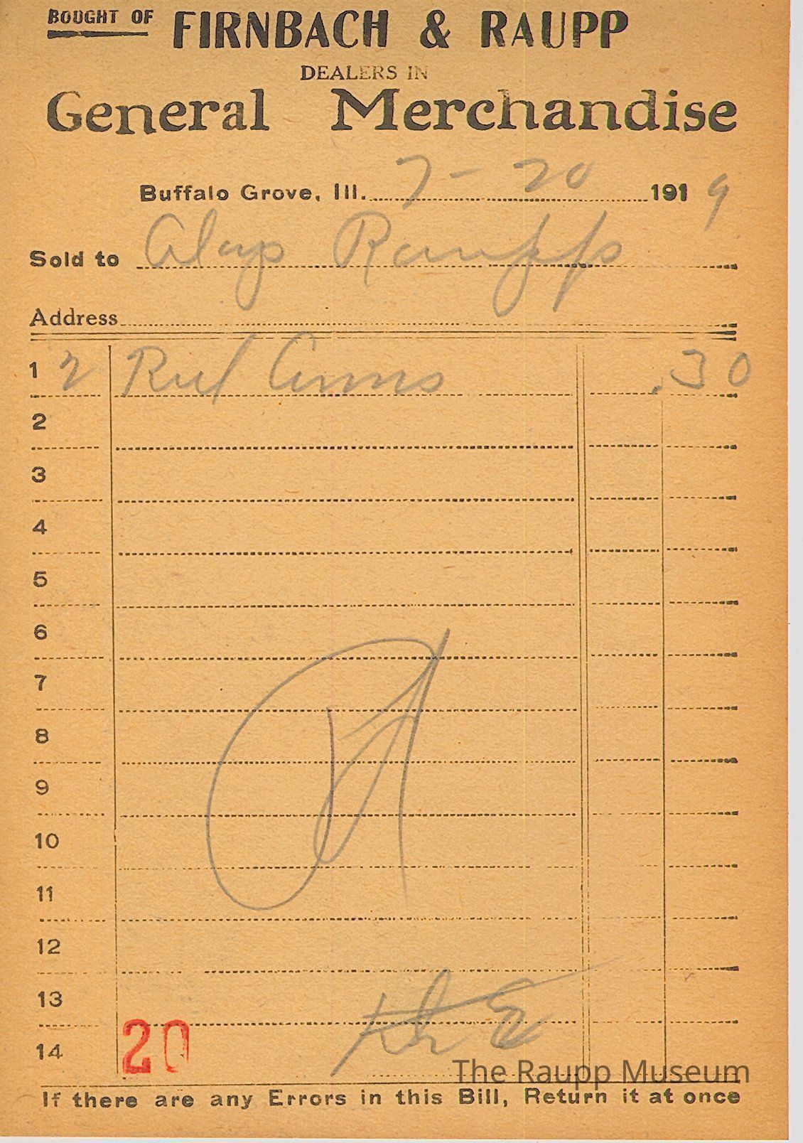 The receipt is for Aloys Raupp who bought 2 reel arms for $0.30. The bill is marked as paid, and there is a red stamp of "20" at the bottom of the receipt. There is another, unreadable handwritten symbol next to the "pd" to mark the bull as paid.