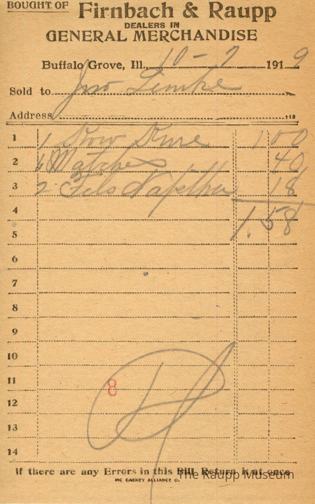 One (1) Firnbach and Raupp store receipt from October 7, 1919. Receipt is rectangular with black printed text and written notes in pencil. The receipt is for Jwo Lemke (?), who bought one stow sture (?) for $1.00, six matches for $0.40, and two Fels Daphler (?) for $0.18. The bill total is $1.58 and the receipt is marked as paid. A red stamp of 8 is located towards the bottom of the page. The text from top to bottom is: BOUGHT OF Firnbach & Raupp; DEALERS IN GENERAL MERCHANDISE; Buffalo Grove, Ill.; Sold to; Address; If there are any Errors in this Bill Return It at once; MC CASKEY ALLIANCE O.Archive Details