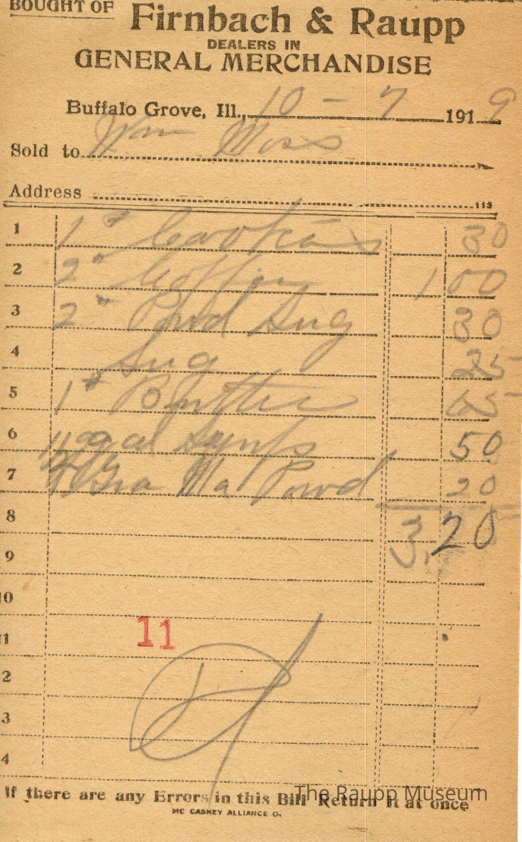 One (1) Firnbach and Raupp store receipt from October 7, 1919. Receipt is rectangular with black printed text and written notes in pencil. The receipt is for William Muss (?), who bought one pound of coffee for $0.30, two pounds of coffee for $1.00k, two pounds of powdered sugar for $0.30, sugar for $0.25, one pound of butter for $0.65, eleven gallons of syrup for $0.50, and one Gra. Ma. Powd. for $0.20. The bill total is $3.20 and the receipt is marked as paid. A red stamp of 11 is located towards the bottom of the page. The text from top to bottom is: BOUGHT OF Firnbach & Raupp; DEALERS IN GENERAL MERCHANDISE; Buffalo Grove, Ill.; Sold to; Address; If there are any Errors in this Bill Return It at once; MC CASKEY ALLIANCE O.Archive Details