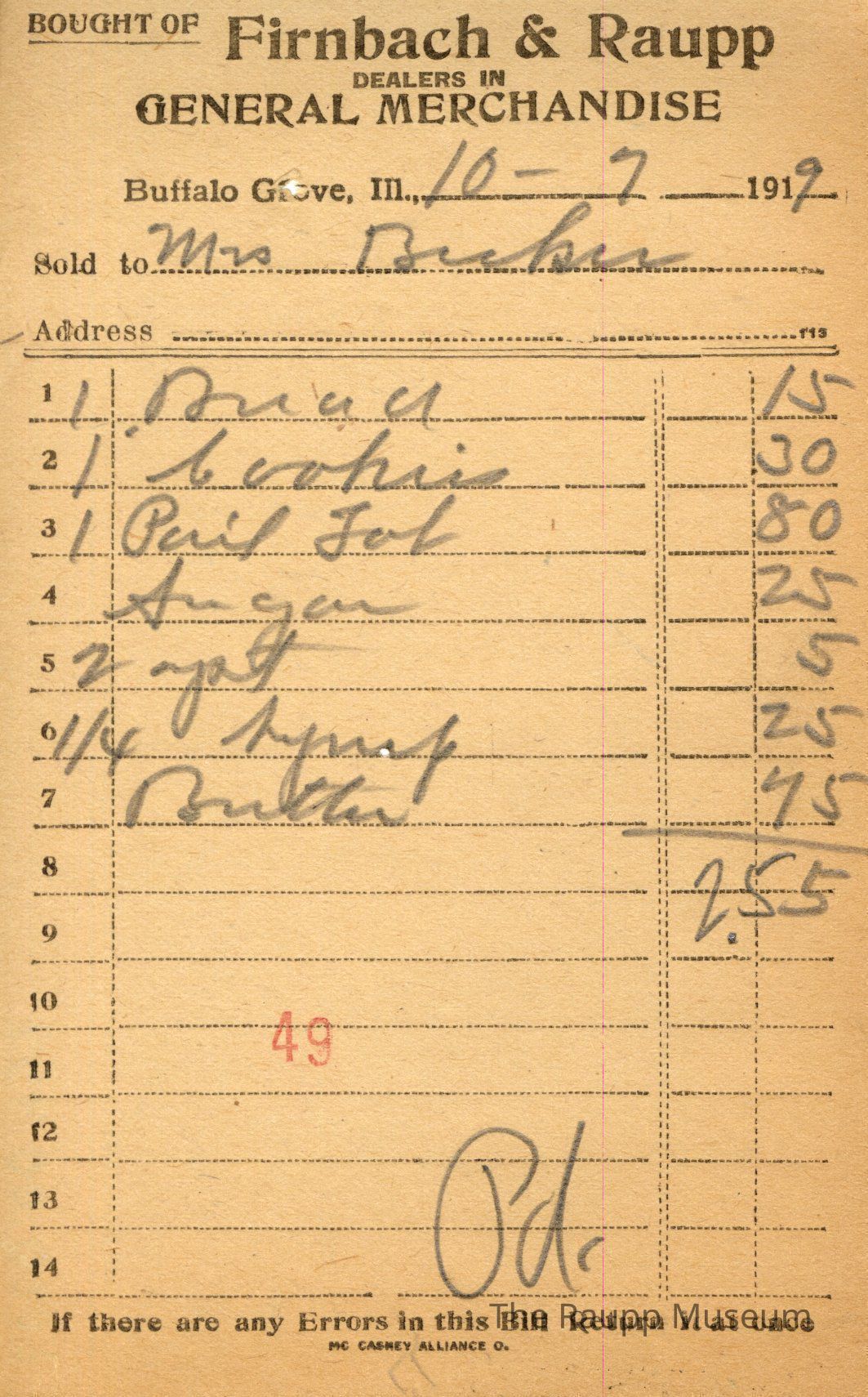 One (1) Firnbach and Raupp store receipt from October 7, 1919. Receipt is rectangular with black printed text and written notes in pencil. The receipt is for Mrs. Brehm, who bought one bread for $0.15, one pound of cookies for $0.30, one pail tub for $0.80, sugar for $0.25, two yeast for $0.05, one-fourth (unit of) syrup for $0.25, and butter for $0.75. The bill total is $2.55 and the receipt is marked as paid. A red stamp of 49 is located towards the bottom of the page. The text from top to bottom is: BOUGHT OF Firnbach & Raupp; DEALERS IN GENERAL MERCHANDISE; Buffalo Grove, Ill.; Sold to; Address; If there are any Errors in this Bill Return It at once; MC CASKEY ALLIANCE O.Archive Details