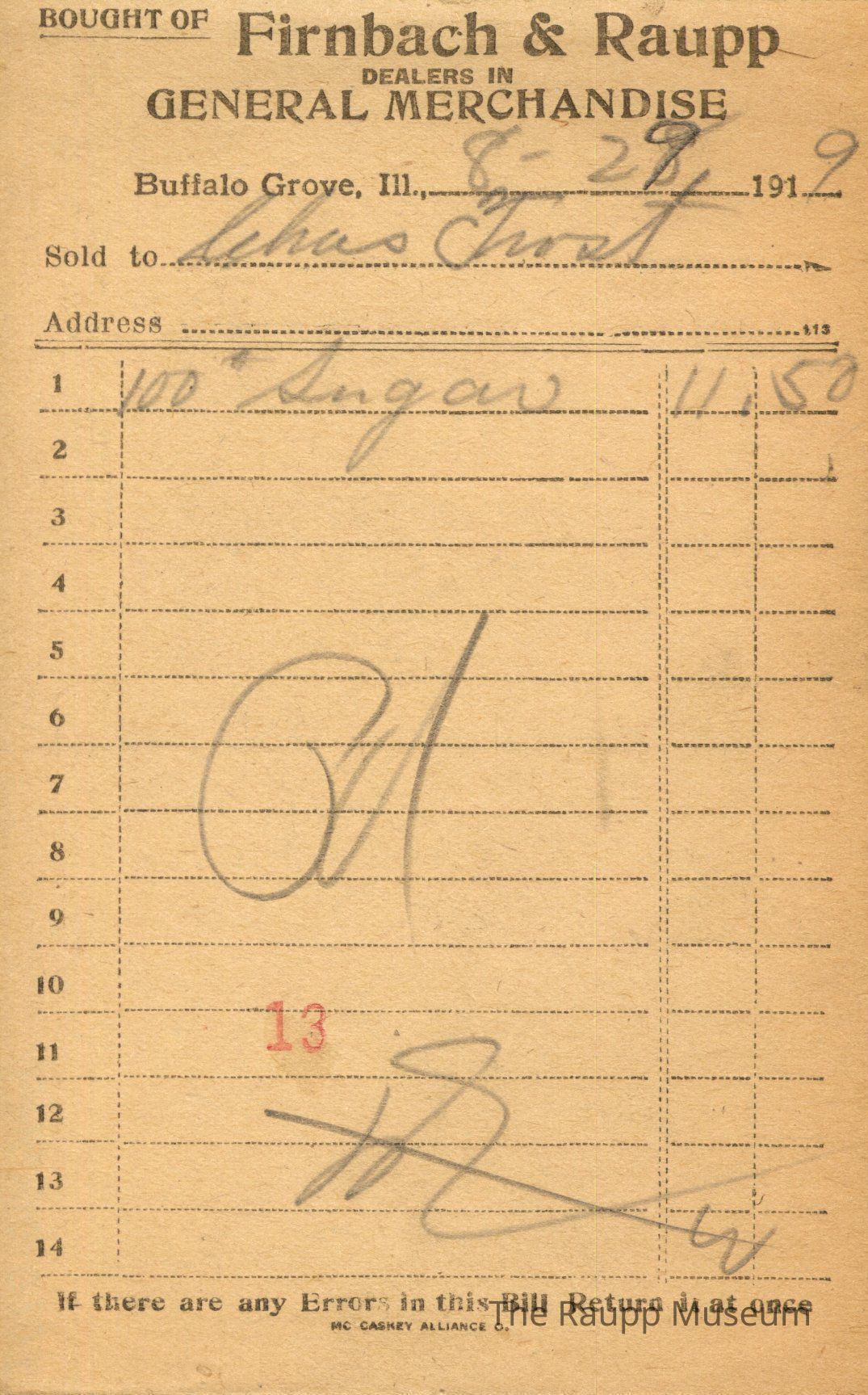 One (1) Firnbach and Raupp store receipt from August 29, 1919. Receipt is rectangular with black printed text and written notes in pencil. The receipt is for Lehas Frost, who bought one hundred pounds of sugar for $11.50. The total is $11.50. A red stamp of 13 is located towards the bottom of the page and the receipt is marked as paid. The text from top to bottom is: BOUGHT OF Firnbach & Raupp; DEALERS IN GENERAL MERCHANDISE; Buffalo Grove, Ill.; Sold to; Address; If there are any Errors in this Bill Return It at once; MC CASKEY ALLIANCE O.Archive Details
