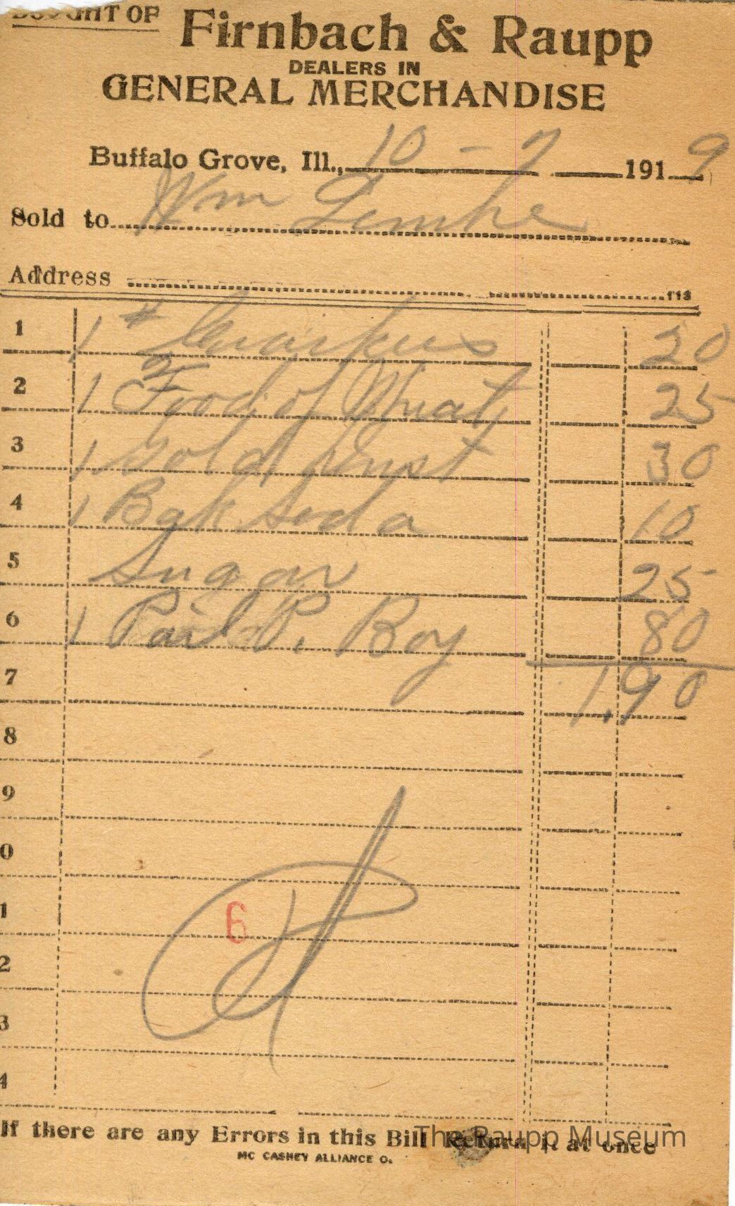 One (1) Firnbach and Raupp store receipt from October 7, 1919. Receipt is rectangular with black printed text and written notes in pencil. The receipt is for William Lemke, who bought one pound of crackers for $0.20, one Food of Wheat for $0.25, one Gold Wust (?) for $0.30, one baking soda for $0.10, sugar for $0.25, and one Pail P. Boy for $0.80. The bill total is $1.90 and the receipt is marked as paid. A red stamp of 6 is located towards the bottom of the page. The text from top to bottom is: BOUGHT OF Firnbach & Raupp; DEALERS IN GENERAL MERCHANDISE; Buffalo Grove, Ill.; Sold to; Address; If there are any Errors in this Bill Return It at once; MC CASKEY ALLIANCE O.Archive Details