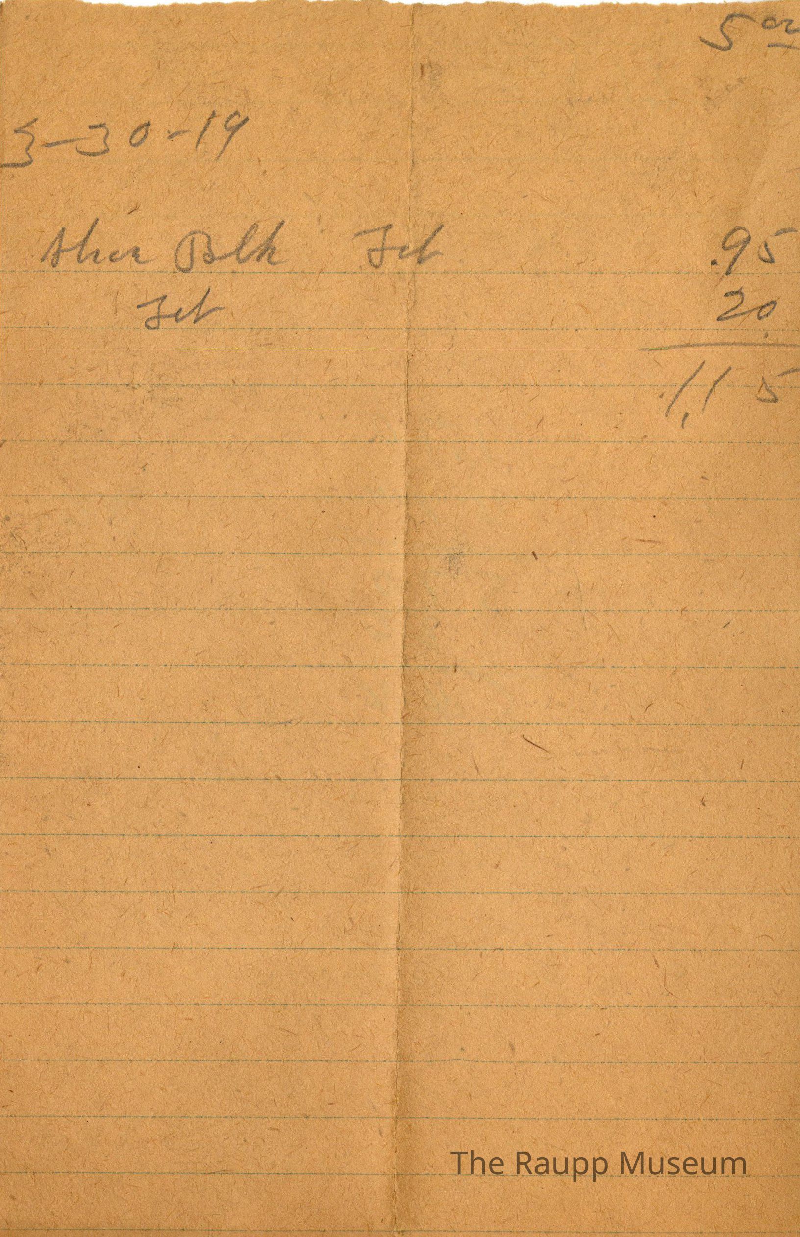 One (1) receipt from March 30, 1919. The person bought shoe black for $0.95 and paid off a tab of $0.20. The bill total is $1.15.