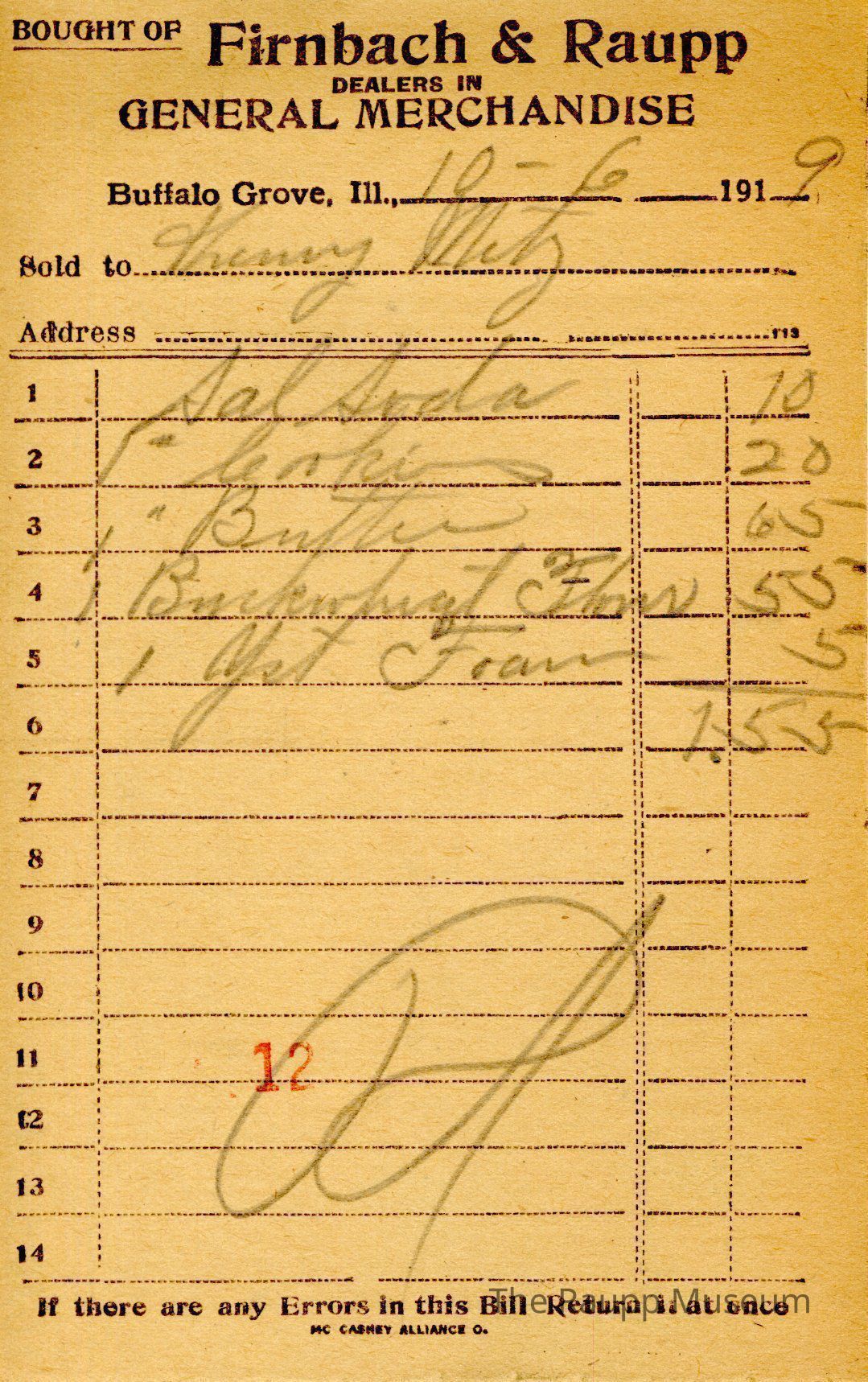 One (1) Firnbach and Raupp store receipt from October 6, 1919. Receipt is rectangular with black printed text and written notes in pencil. The receipt is for Kenny Metz (?), who bought one gallon of soda for $0.10, one pound of cookies for $0.20, one pound of butter for $0.65, one buckwheat flour for $0.55, and one yeast foam for $0.05. The bill total is $1.55 and the receipt is marked as paid. A red stamp of 12 is located towards the bottom of the page. The text from top to bottom is: BOUGHT OF Firnbach & Raupp; DEALERS IN GENERAL MERCHANDISE; Buffalo Grove, Ill.; Sold to; Address; If there are any Errors in this Bill Return It at once; MC CASKEY ALLIANCE O.Archive Details