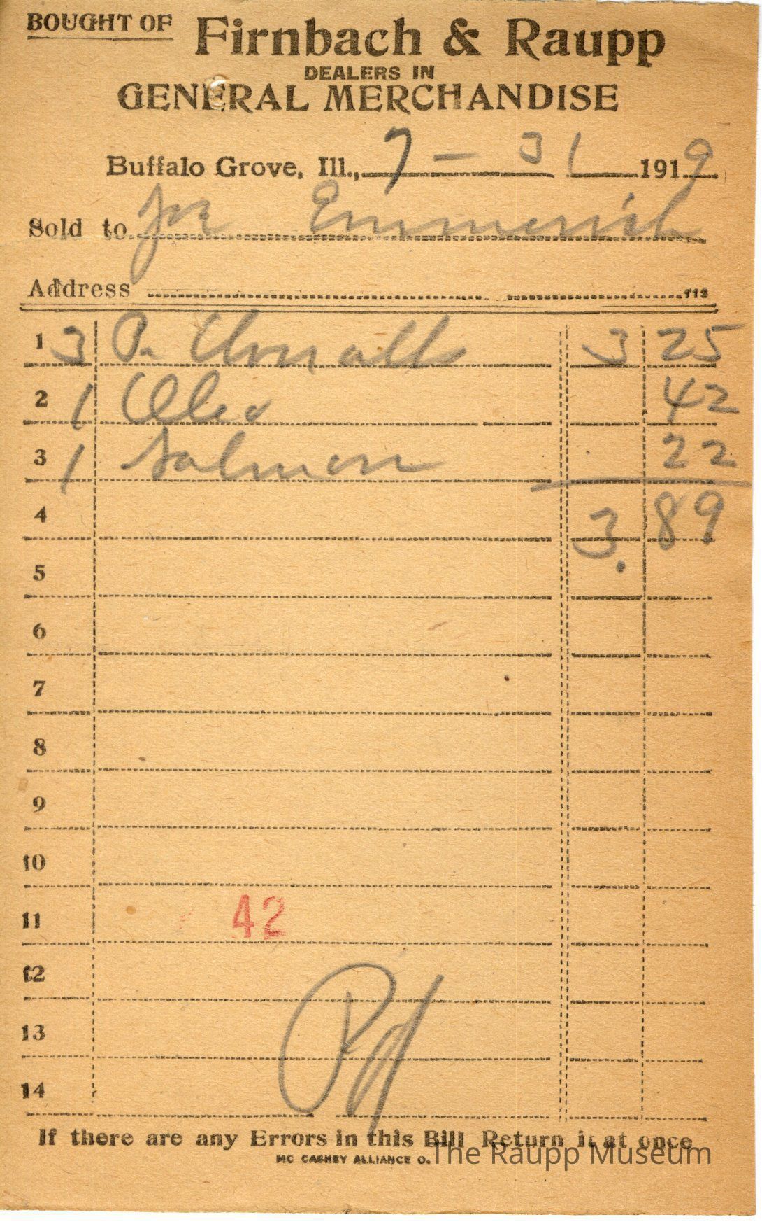 One (1) Firnbach and Raupp store receipt from July 31, 1919. Receipt is rectangular with black printed text and written notes in pencil. The receipt is for Joe Emmerich, who bought 3 pairs of overalls (?) for $3.25, 1 Oleo for $0.42, and 1 salmon for $0.22. The bill total is $3.89. There is a red stamp of "42" at the bottom with the bill marked as paid.