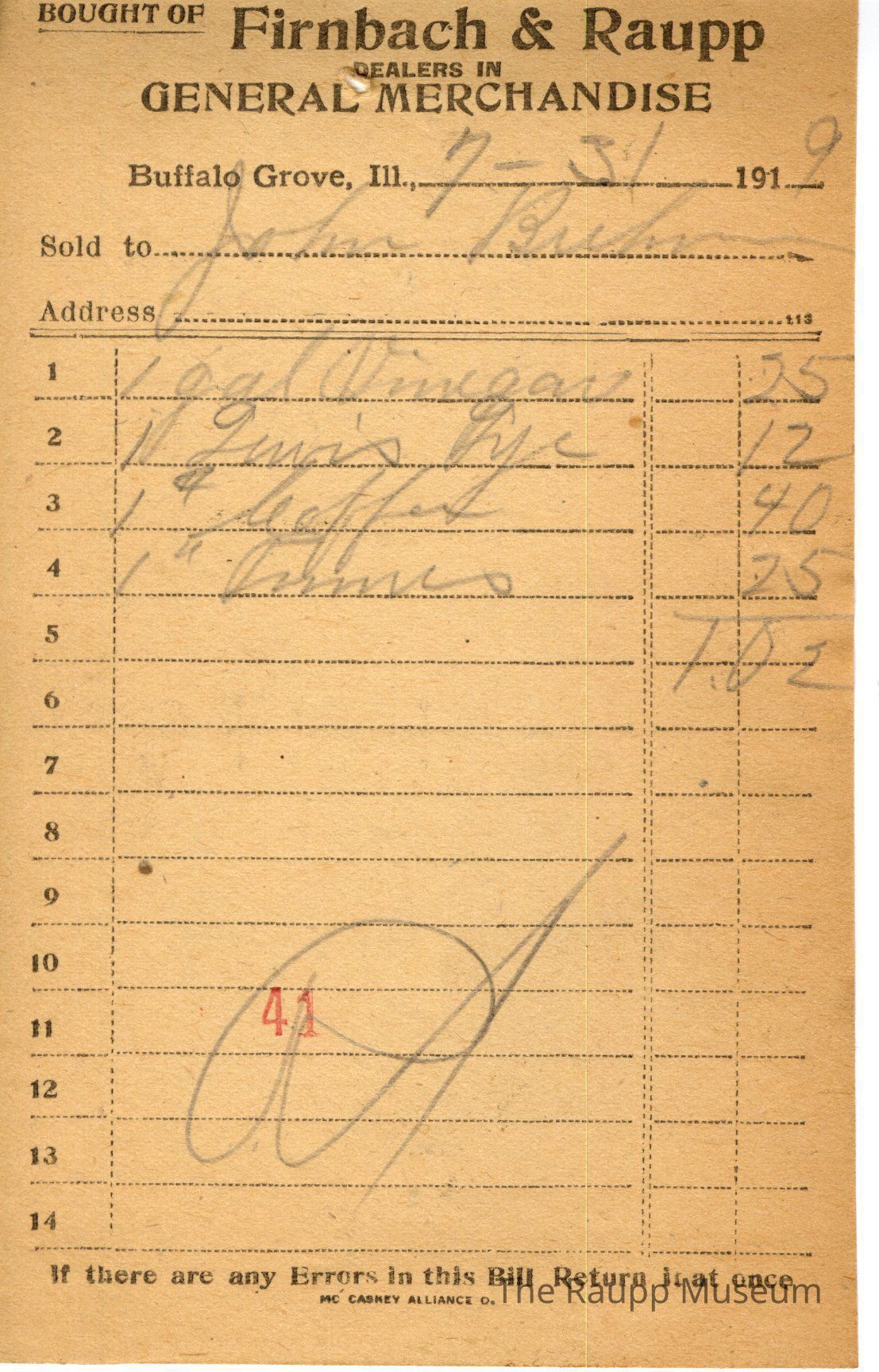 The black text is as follows, from top to bottom: Bought of Firnbach & Raupp; Dealers in GENERAL MERCHANDISE; Buffalo Grove, Ill.; Sold to; Address; if there are any Errors in this Bill Return it at once; MC CASKEY ALLIANCE O.Archive Details