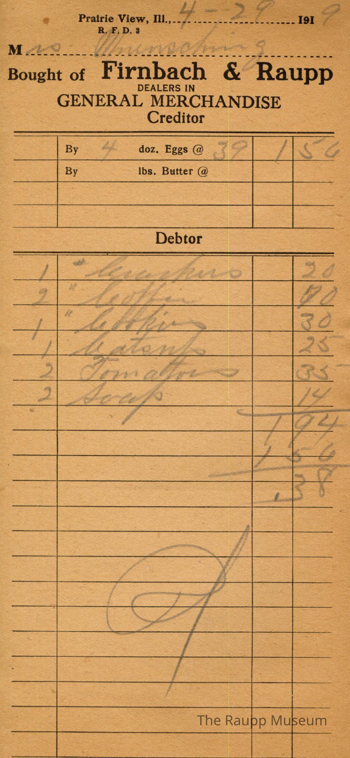 One (1) Firnbach and Raupp store reciept from April 29, 1919. Receipt is rectangular with black printed text and written notes in pencil. The receipt is for Mrs Mninsching(?), who sold 4 dozen eggs at $0.39 for $1.56. She bought 1 pound of crackers for $0.20, 2 pounds of coffee for $0.70, 1 pound of cookies for $0.30, 1 catsup for $0.25, 2 tomatoes for $0.35, and 2 soup for $0.14. Bill total was $0.38. The bill is marked as paid.