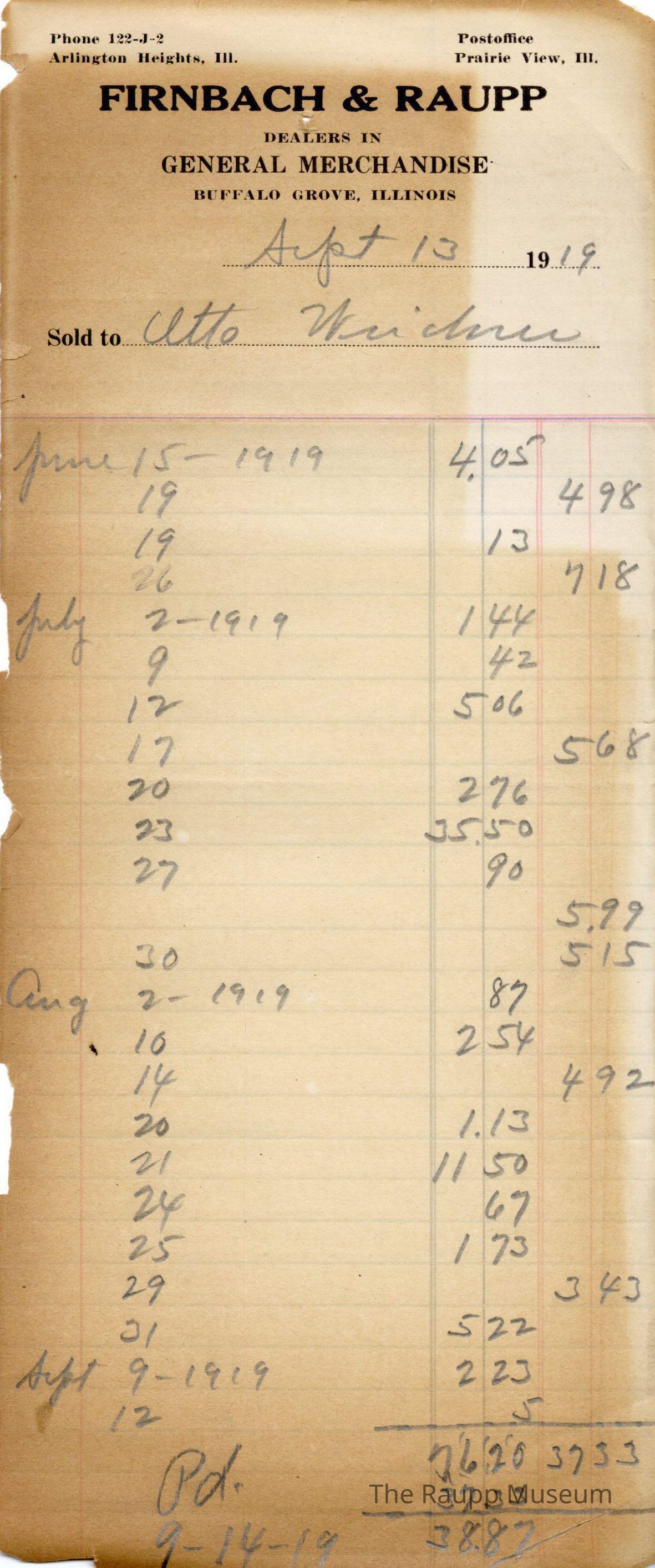 One (1) Firnbach and Raupp store receipt from September 13, 1919. Receipt is rectangular with black printed text and written notes in pencil. The receipt is for Otto Weidner, listing all the that he accumulated since June 15th of that year and the amount of money that is owed on credit. The written information is, from top to bottom: June 15th - $4.05 (unpaid), 19th $4.98 (paid), 19th - $0.13 (unpaid), 26th - $7.18 (unpaid), July 2 - $1.44 (unpaid), 9th - $0.42 (unpaid), 12th - $5.06 (unpaid), 17th - $5.68 (unpaid), 20th - $2.76 (unpaid), 23rd - $35.50 (unpaid), 27th - $0.90 (unpaid), 27th - $5.99 (paid), 30th - $5.15 (paid), August 2nd - $0.87 (unpaid), 10th - $2.54 (unpaid), 14th - $4.92 (paid), 20th - $1.13 (unpaid), 21st - $11.50 (unpaid), 24th - $0.67 (unpaid), 25th - $1.73 (unpaid), 29th - $3.43 (paid), 31st - $5.22 (unpaid), September 9th - $2.23 (unpaid), 12th - 0.05 (unpaid). The remaining sum is $38.87, marked with Pd. The black text is as follows, from top to bottom: Phone 122-J-2; Arlington Heights, Ill.; Postoffice Prairie View, Ill.; FIRNBACH & RAUPP; DEALERS IN GENERAL MERCHANDISE; BUFFALO GROVE, ILLINOIS; Sold toArchive Details