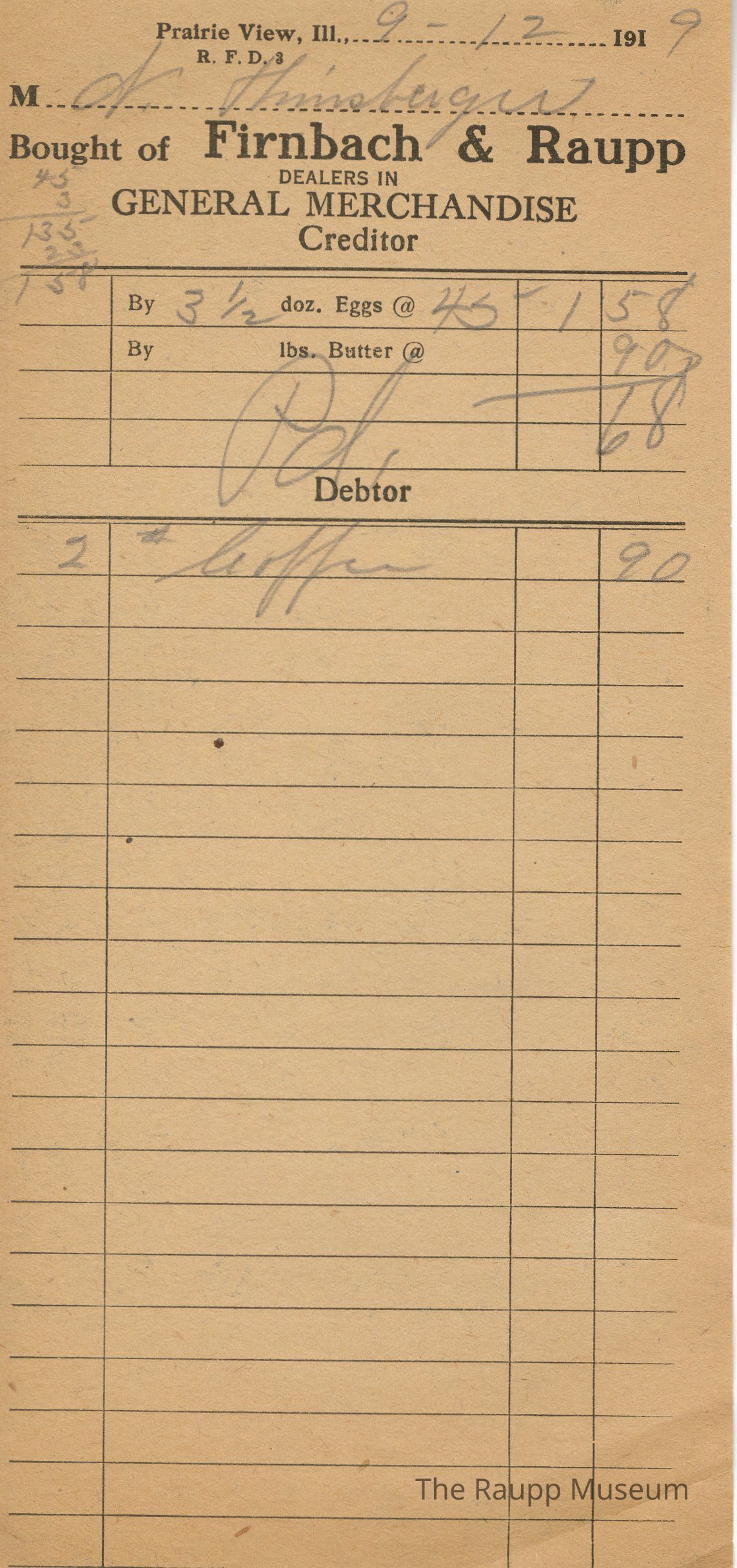 One (1) Firnbach and Raupp store receipt from September 12, 1919. Receipt is rectangular with black printed text and written notes in pencil. The receipt is for N. Thinsberger (?), who bought two pounds of coffee for $0.90. The customer also traded in three and one-half dozens of eggs at $0.45 per dozen. Bill total is $0.68 for the customer. The bill is marked as paid. The black text is as follows, from top to bottom: Buffalo Grove, Ill.; M; Bought of Firnbach & Raupp; DEALERS IN GENERAL MERCHANDISE; Creditor; DebtorArchive Details