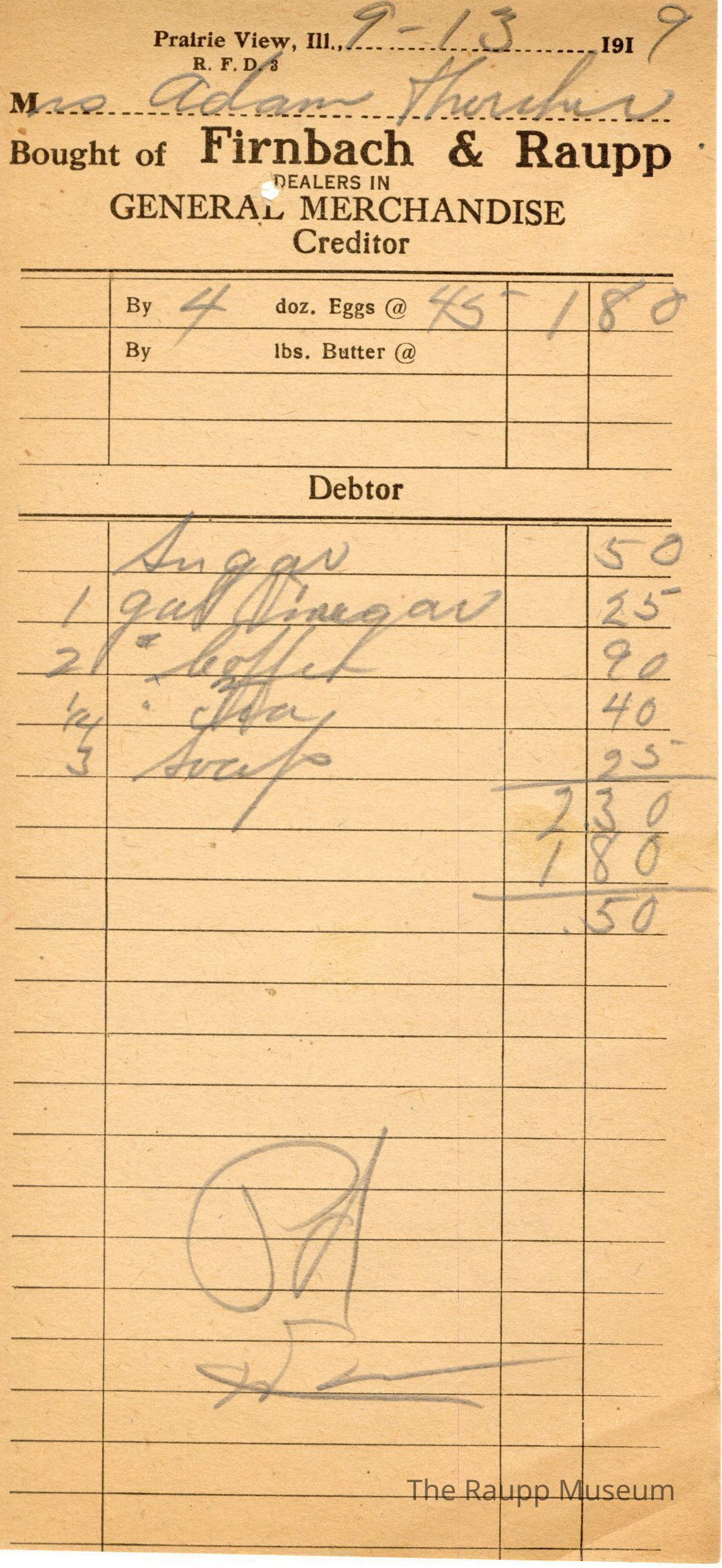 One (1) Firnbach and Raupp store receipt from September 13, 1919. Receipt is rectangular with black printed text and written notes in pencil. The receipt is for Mrs. Adam Thorcher, who bought sugar for $0.50, one gallon of vinegar for $0.25, two pounds of coffee for $0.90, one-fourth pounds of tea for $0.40, and three soaps for $0.25. The customer also traded in four dozens of eggs at $0.45 per dozen. Bill total is $0.50. The bill is marked as paid. The black text is as follows, from top to bottom: Buffalo Grove, Ill.; M; Bought of Firnbach & Raupp; DEALERS IN GENERAL MERCHANDISE; Creditor; DebtorArchive Details