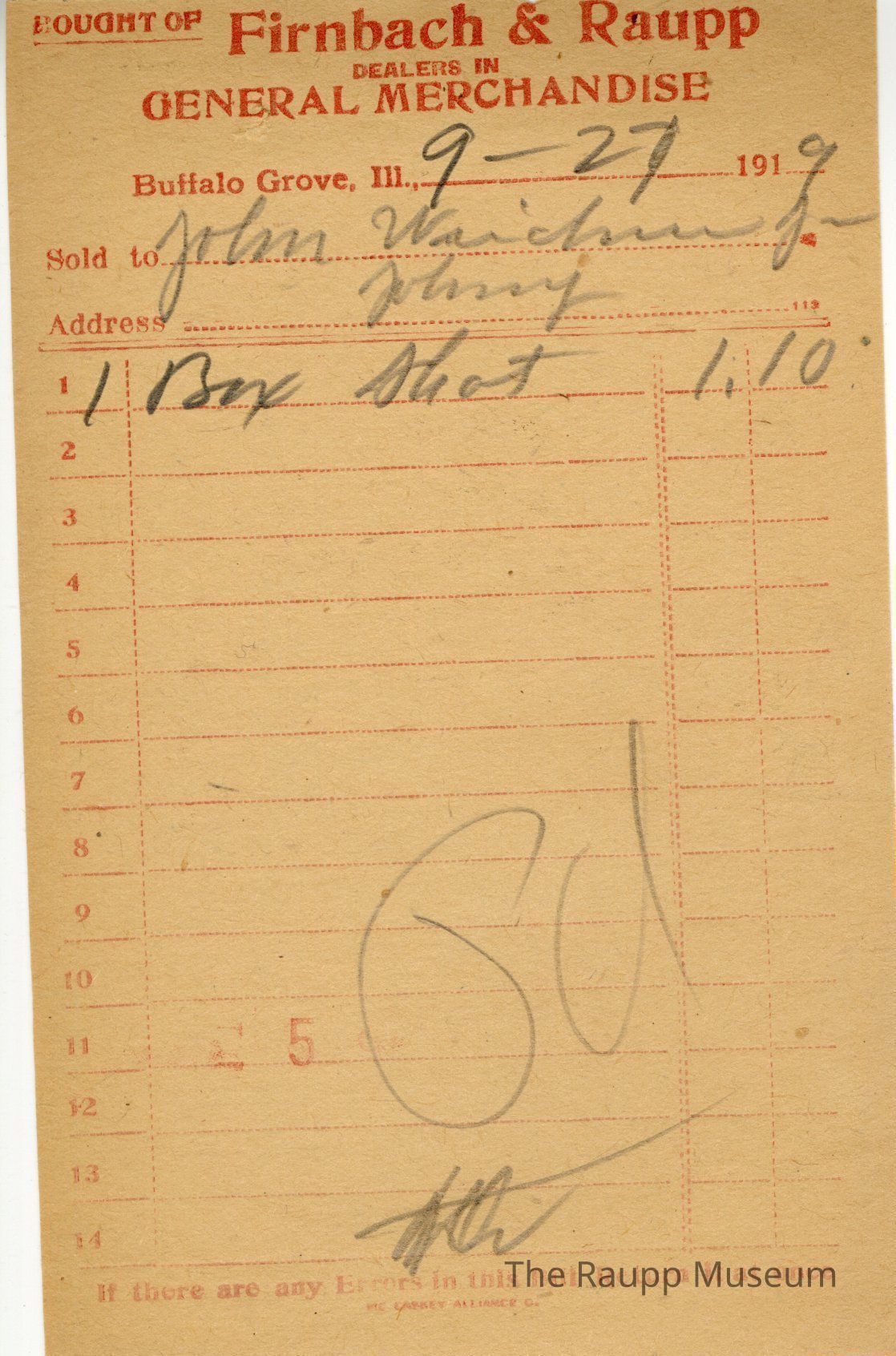 One (1) Firnbach and Raupp store receipt from September 26, 1919. Receipt is rectangular with red printed text and written notes in pencil. The receipt is for John Weidner J. Johnny (?), who bought one box shot for $1.10. Bill total is $1.10. There is a red stamp of 5 towards the bottom and the bill is marked as paid. The red text is as follows, from top to bottom: Bought of Firnbach & Raupp; Dealers in GENERAL MERCHANDISE; Buffalo Grove, Ill.; Sold to; Address; If there are any Errors in this Bill Return it at once; MCCASKEY ALLIANCE O.Archive Details