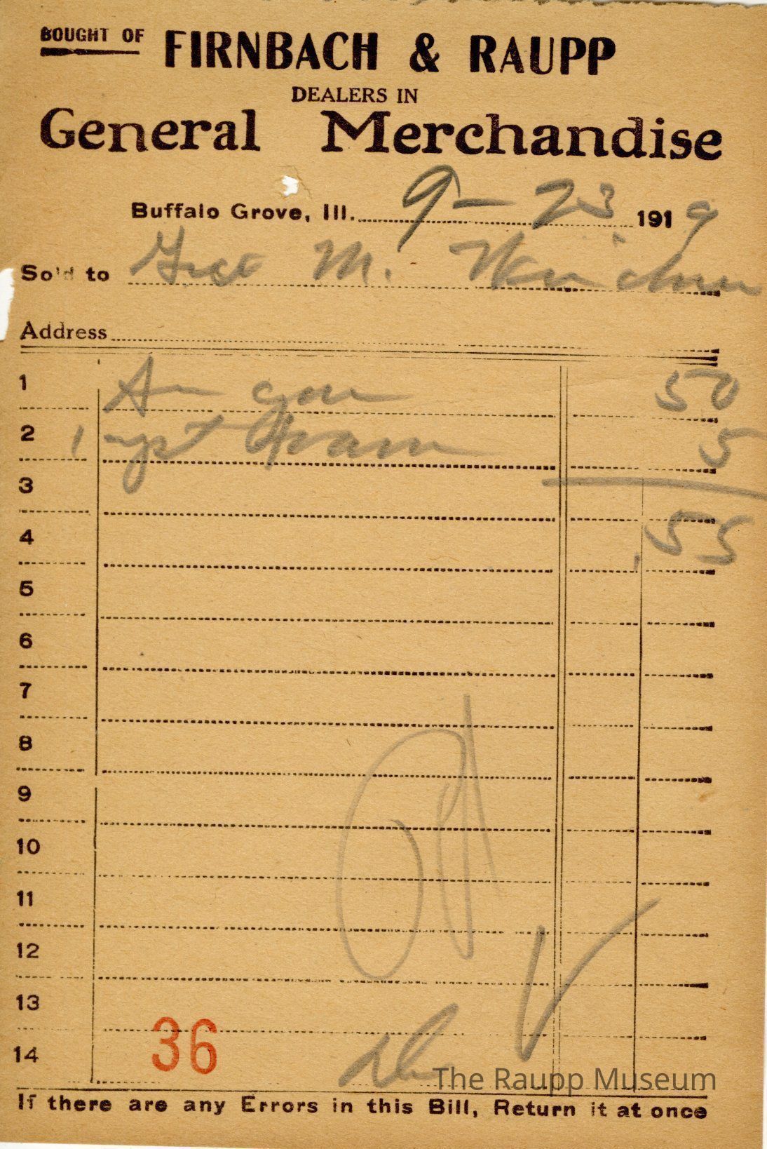 One (1) Firnbach and Raupp store receipt from September 23, 1919. Receipt is rectangular with black printed text and written notes in pencil. The receipt is for Geo. M Weidner, who bought sugar for $0.50 and one yeast foam for $0.05. Bill total is $0.55. There is a red stamp of 36 towards the bottom and the bill is marked as paid. The black text is as follows, from top to bottom: BOUGHT OF FIRNBACH & RAUPP; DEALERS IN General Merchandise; Buffalo Grove, Ill.; Sold to; Address; If there are any Errors in this Bill, Return it at once.Archive Details