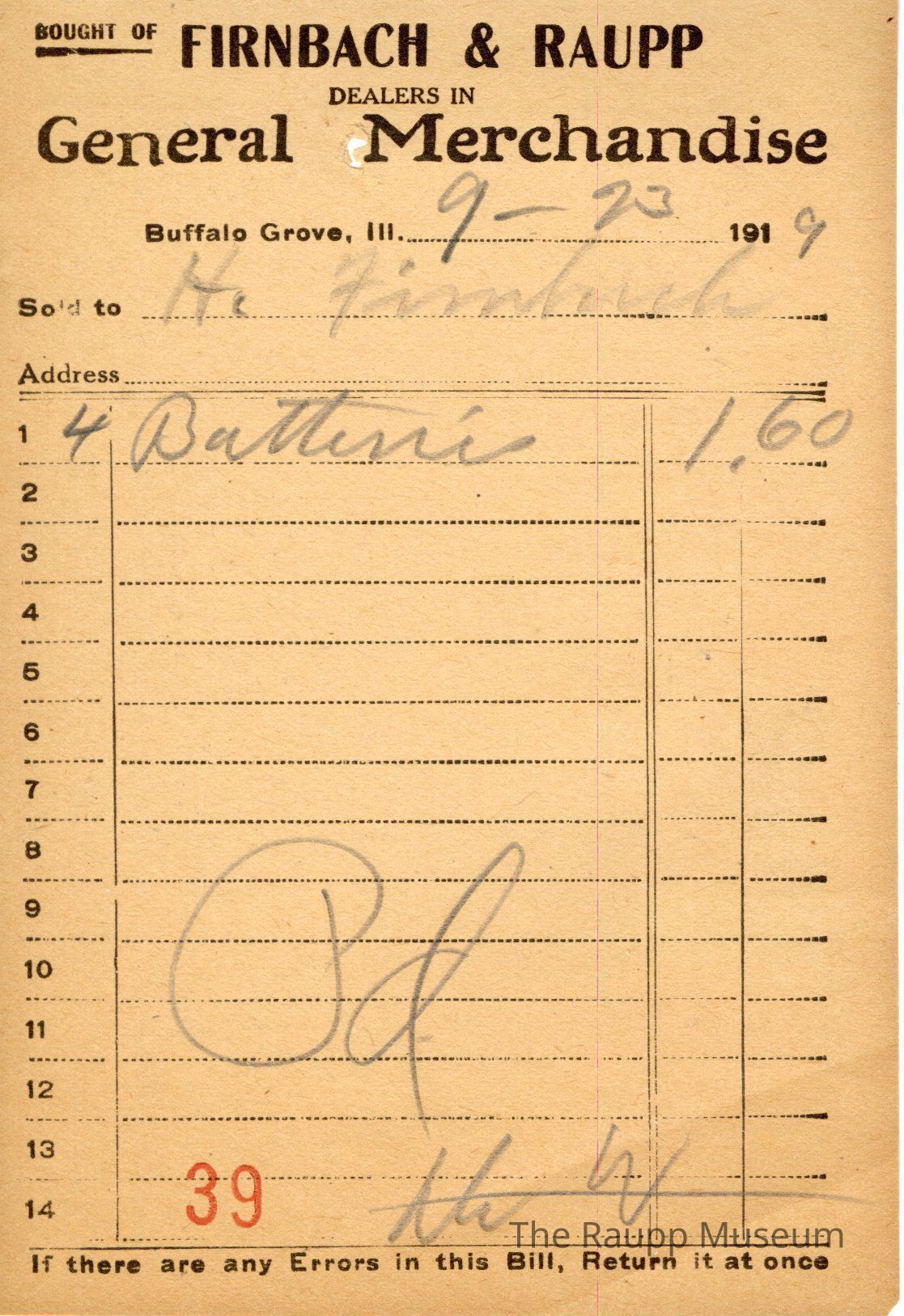 One (1) Firnbach and Raupp store receipt from September 23, 1919. Receipt is rectangular with black printed text and written notes in pencil. The receipt is for H. Firnbach, who bought four batteries for $1.60. Bill total is $1.60. There is a red stamp of 39 towards the bottom and the bill is marked as paid. The black text is as follows, from top to bottom: BOUGHT OF FIRNBACH & RAUPP; DEALERS IN General Merchandise; Buffalo Grove, Ill.; Sold to; Address; If there are any Errors in this Bill, Return it at once.Archive Details