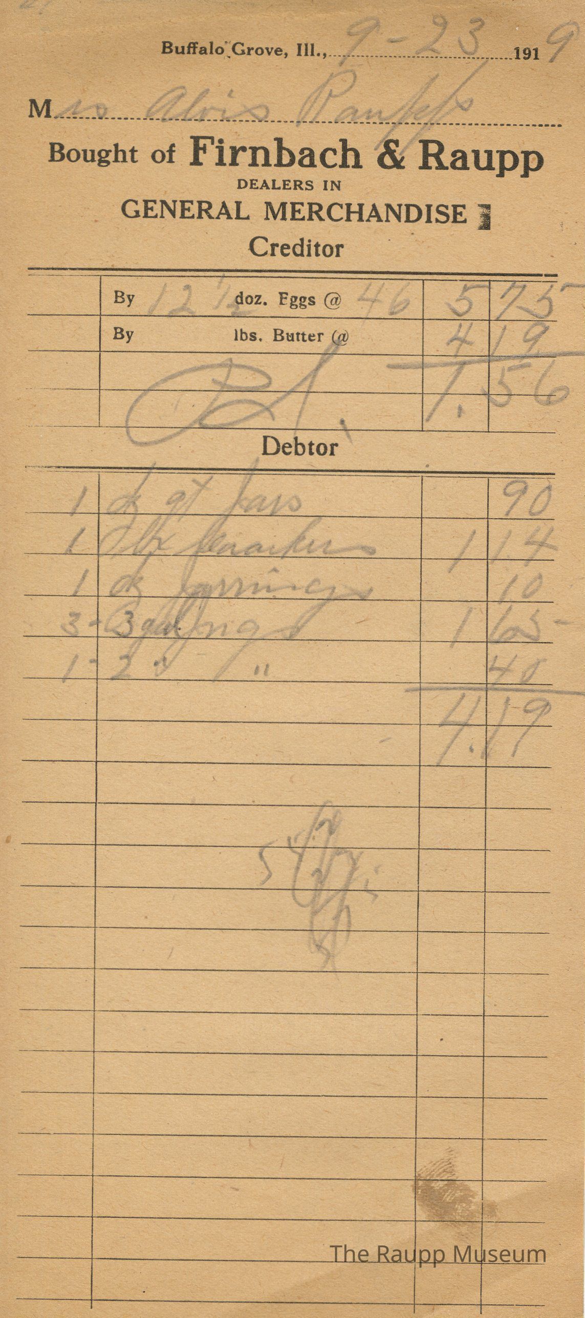 One (1) Firnbach and Raupp store receipt from September 23, 1919. Receipt is rectangular with black printed text and written notes in pencil. The receipt is for Mrs. Alois Raupp, who bought one dozen of quart jars for $0.90, one box of crackers for $1.14, one dozen jarrings (?) for $0.10, three three-gallon jugs for $1.65, and one two-gallon jug for $0.40. The customer also traded in twelve and a half dozens of eggs at $0.46 per dozen. Bill total is $1.56 for the customer. The bill is marked as paid. The black text is as follows, from top to bottom: Buffalo Grove, Ill.; M; Bought of Firnbach & Raupp; DEALERS IN GENERAL MERCHANDISE; Creditor; DebtorArchive Details