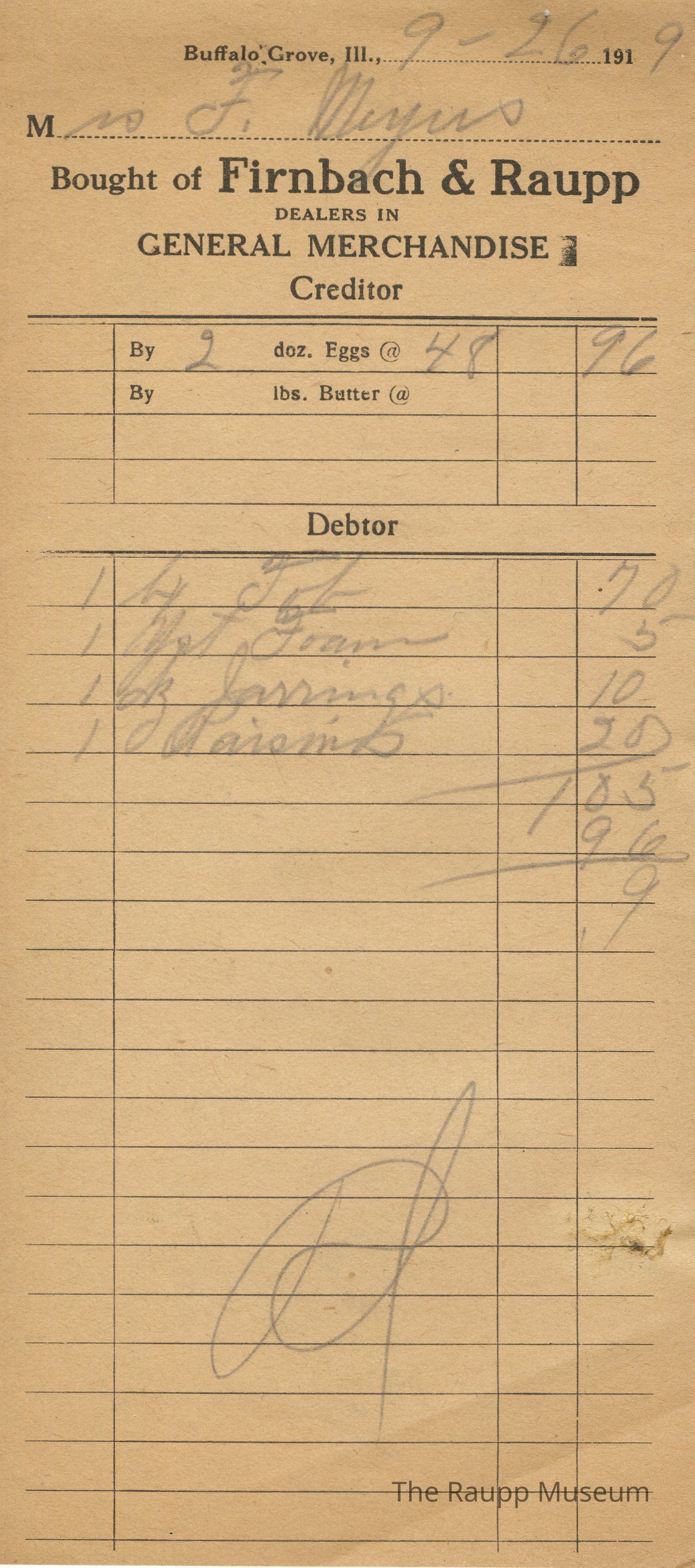 One (1) Firnbach and Raupp store receipt from September 26, 1919. Receipt is rectangular with black printed text and written notes in pencil. The receipt is for Mrs. F. Meyers, who bought one box of tob (?) for $0.70, one yeast foam for $0.05, one dozen of jarrings (?) for $0.10, and one raisins for $0.20. The customer also traded in two dozens of eggs at $0.48 per dozen. Bill total is $0.09. The bill is marked as paid. The black text is as follows, from top to bottom: Buffalo Grove, Ill.; M; Bought of Firnbach & Raupp; DEALERS IN GENERAL MERCHANDISE; Creditor; DebtorArchive Details