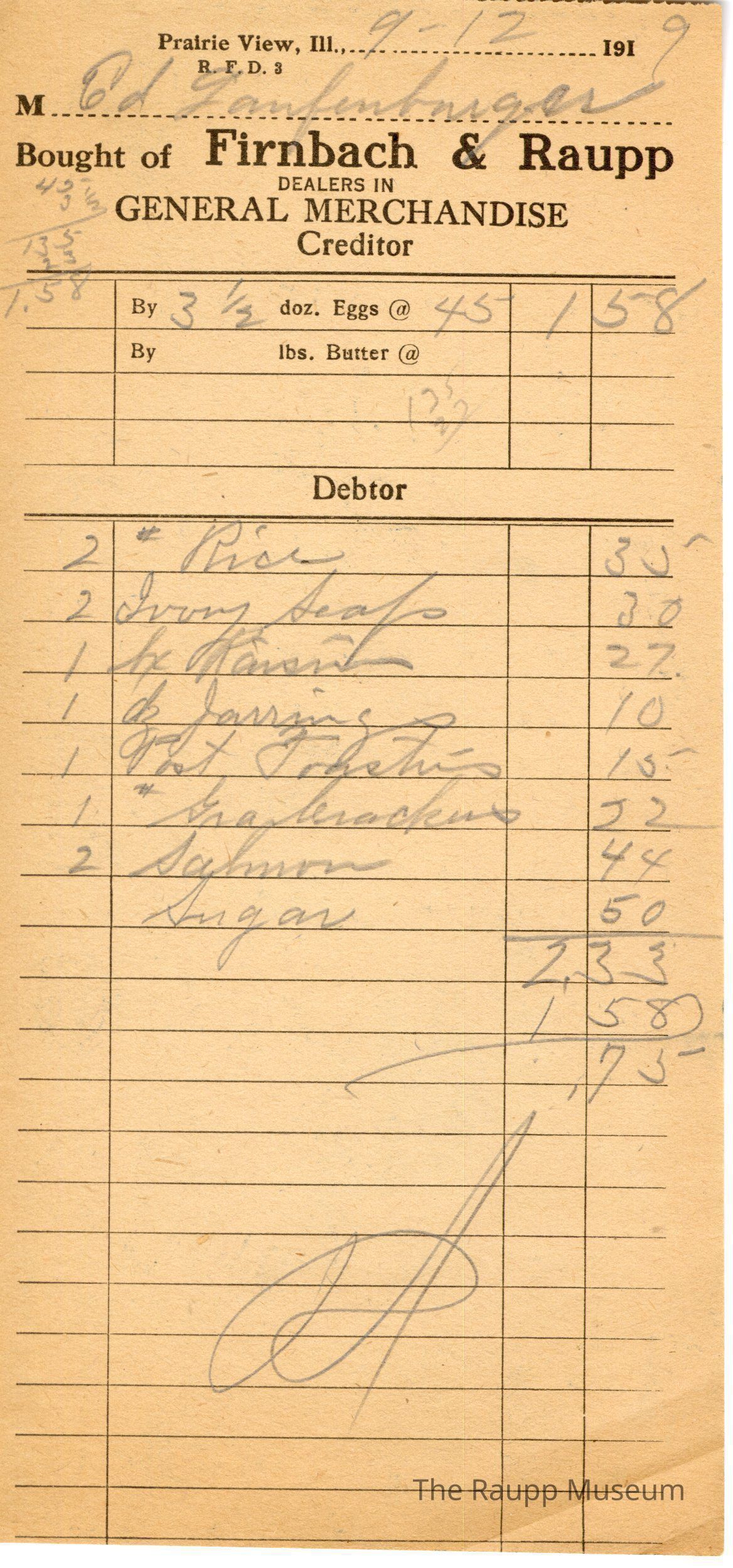 One (1) Firnbach and Raupp store receipt from September 12, 1919. Receipt is rectangular with black printed text and written notes in pencil. The receipt is for Ed Lanfenburger, who bought two pounds of rice for $0.35, two ivory soaps for $0.30, one box of raisins for $0.27, one dozen jarrings for $0.10, one Post Toasties for $0.15, one pound of graham crackers for $0.22, two salmon for $0.44, and sugar for $0.50. The customer also traded in three and one-half dozens of eggs at $0.45 per dozen. Bill total is $0.75. The bill is marked as paid. The black text is as follows, from top to bottom: Buffalo Grove, Ill.; M; Bought of Firnbach & Raupp; DEALERS IN GENERAL MERCHANDISE; Creditor; DebtorArchive Details