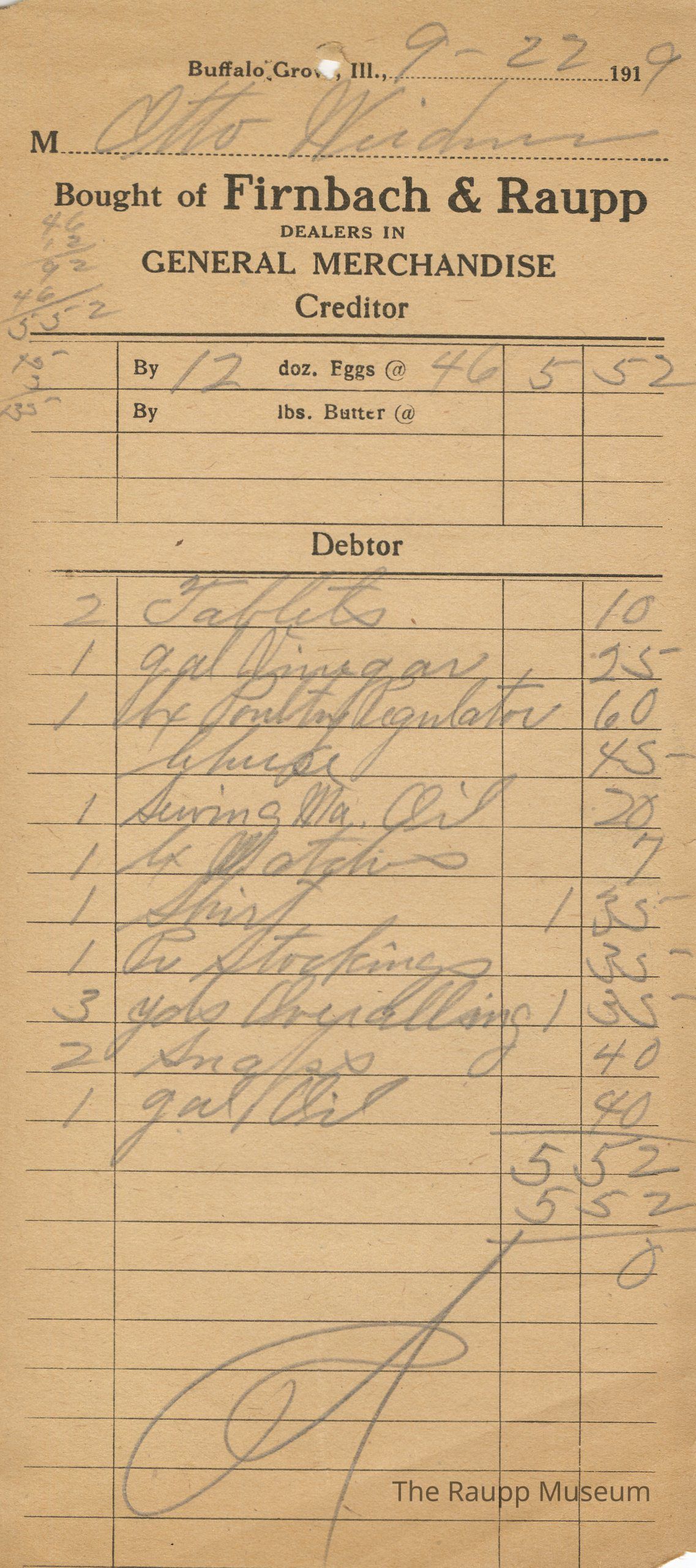 One (1) Firnbach and Raupp store receipt from September 22, 1919. Receipt is rectangular with black printed text and written notes in pencil. The receipt is for Otto Weidner, who bought two tablets for $0.10, one gallon of vinegar for $0.25, one box of Poultry Regulator for $0.60, cheese for $0.45, one Sewing Ma. oil (?) for $0.20, one box of matches for $0.07, one shirt for $1.35, one pair of stockings for $0.35, three yards of orenalling (?) for $1.35, two soaps for $0.40, and one gallon of oil for $0.40. The customer also traded in twelve dozens of eggs at $0.46 per dozen. Bill total is $0. The bill is marked as paid. The black text is as follows, from top to bottom: Buffalo Grove, Ill.; M; Bought of Firnbach & Raupp; DEALERS IN GENERAL MERCHANDISE; Creditor; DebtorArchive Details