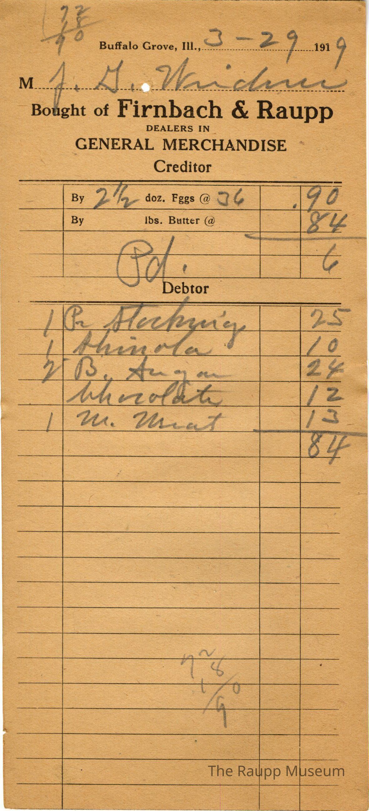 One (1) Firnbach & Raupp store receipt from March 29, 1919. The receipt is rectangular with black printed ink and handwritten notes in pencil. The receipt is for J. G. Weidner, who brought 2 1/2 dozen eggs for $0.36 per dozen, totaling to $0.90. They also bought 1 pair of stockings for $0.25, 1 Shinola for $0.10, 2 bags of sugar for $0.24, Chocolate for $0.12, and (?) Meat for $0.13. The bill total is $0.84. There is a "Pd." to indicate that it was paid. They received $0.06 in return.