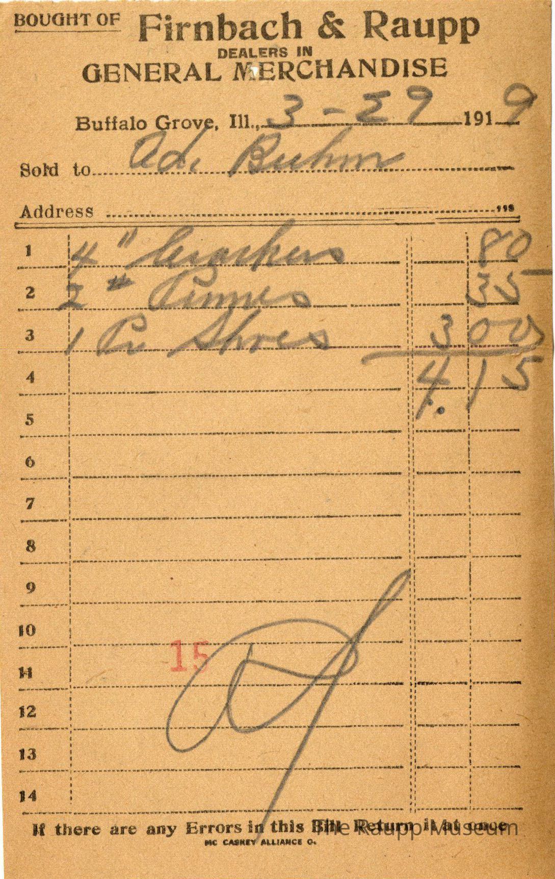 The black printed text is as follows, from top to bottom: Bought of Firnbach & Raupp; Dealers in GENERAL MERCHANDISE; Buffalo Gove. Ill, 191; Sold to; If there are any errors in this Bill Return it at once; MC CASKEY ALLIANCE O.Archive Details