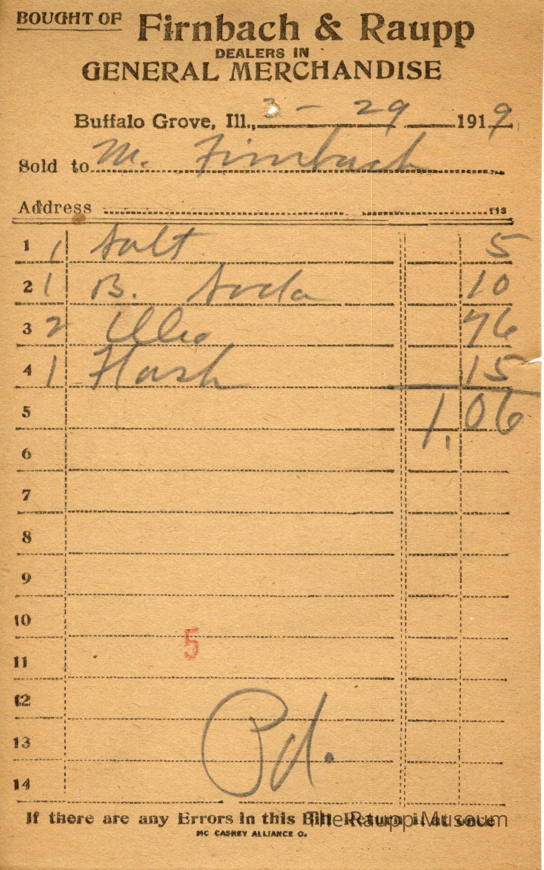 One (1) Firnbach & Raupp store receipt from March 29, 1919. The receipt is rectangular with black printed ink and handwritten notes in pencil. The receipt is for M. Firnbach, who bought 1 Salt for $0.05, 1 Bottle of Soda for $0.10, 2 Oleo for $0.76, and 1 (?) Hash for $0.15. The bill total is $1.06. There is a red stamp of 15 close to the bottom, along with "Pd." to indicate that it was paid.