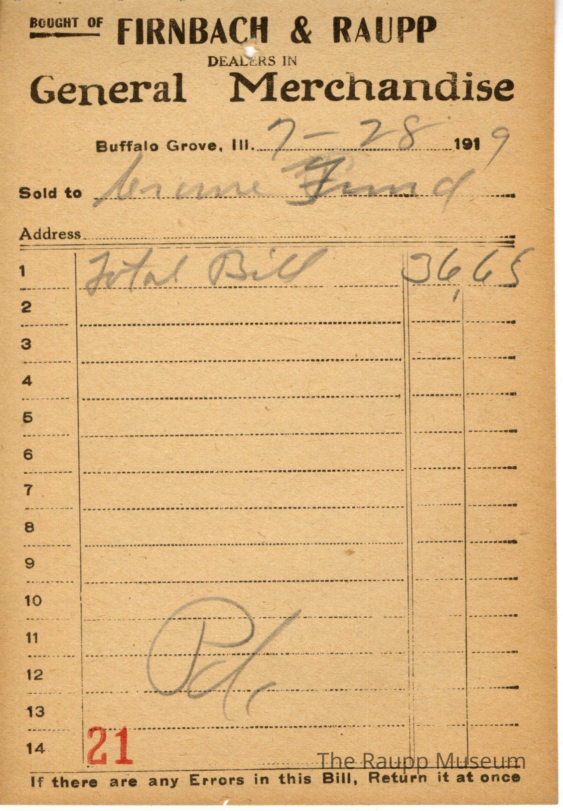 The black text is as follows, from top to bottom: Bought of Firnbach & Raupp; DEALERS IN; GENERAL MERCHANDISE; Buffalo Grove, Ill; Sold to; Address; If there are any Errors in this Bill, Return it at once;Archive Details