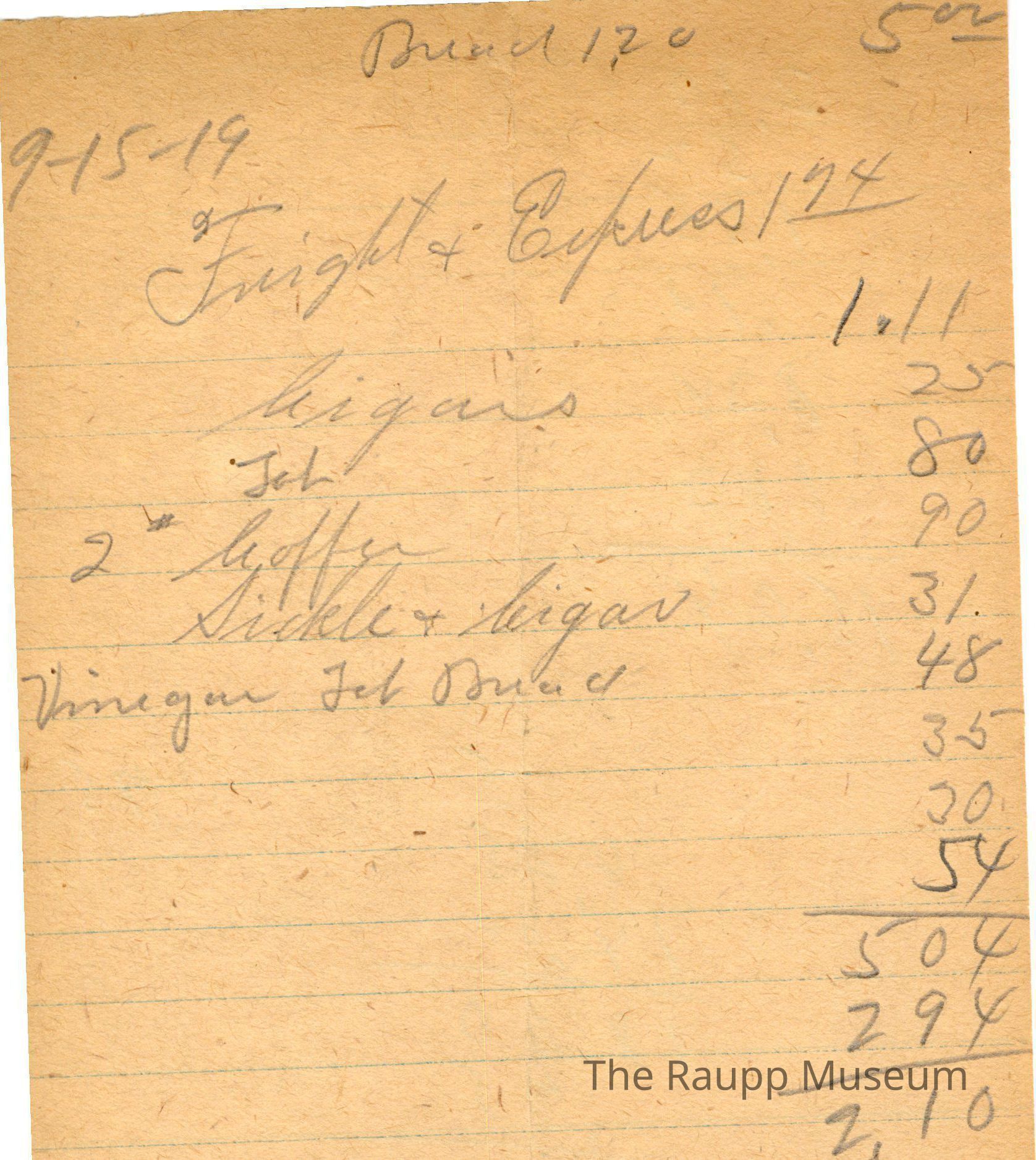 One (1) Firnbach and Raupp store receipt from September 15, 1919. Receipt is rectangular with no printed text and written notes in pencil. The receipt is for an unknown customer, who bought cigars for $0.25, tol (?) for $0.80. two pounds of coffee for $0.90. sickle and cigar (?) for $0.31, and vinegar tol (?) bread for $0.48. It is also marked on the top that bread was priced at $1.20 and freight & eiprees (?) was marked at $1.74. Other prices of $5.00, $1.11, $0.35, $0.30, and $0.54 are also marked. The bill total appears to be $5.04 but was reduced by $2.94 for the final total of $2.10.Archive Details