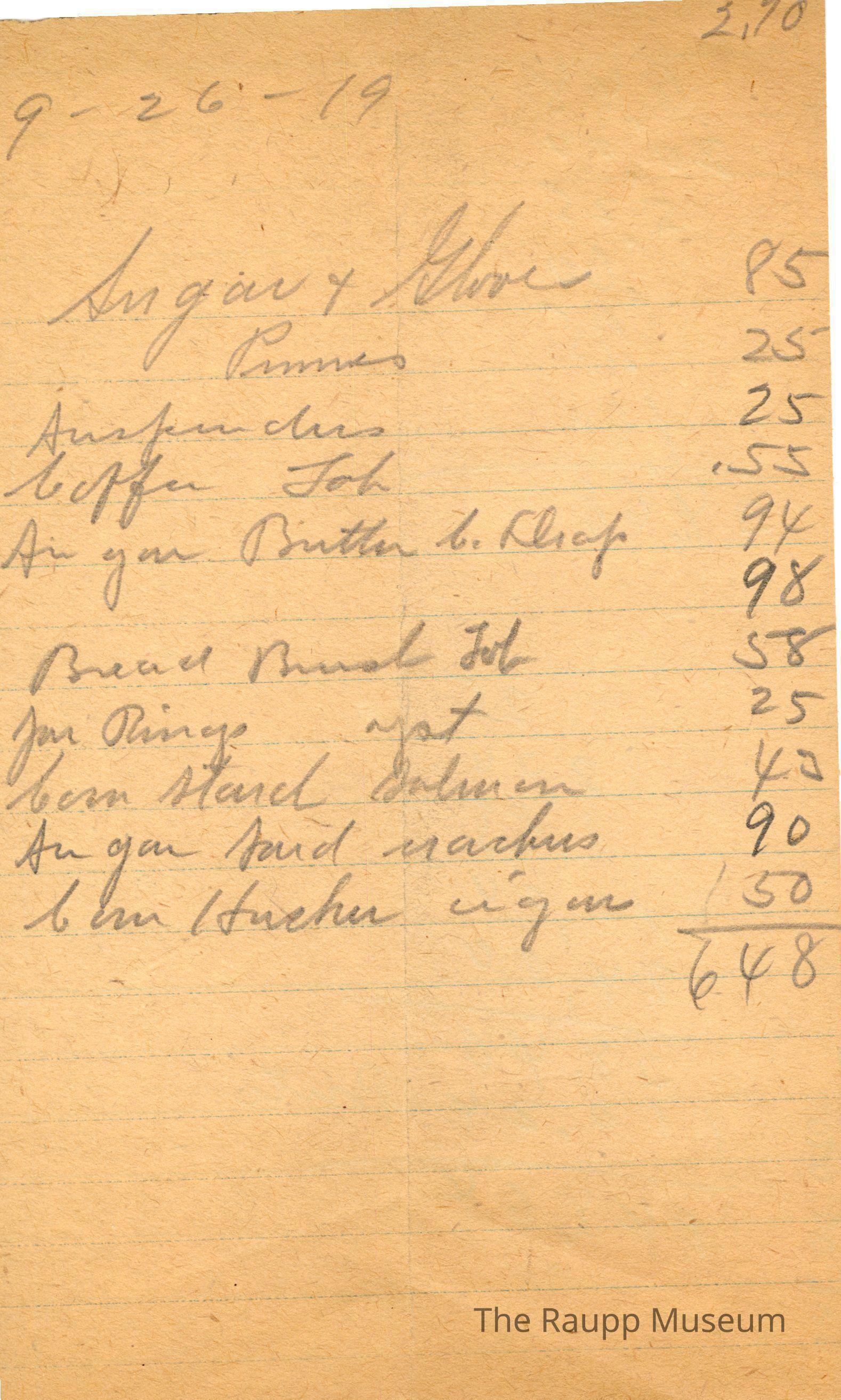 One (1) Firnbach and Raupp store receipt from September 26, 1919. Receipt is rectangular with no printed text and written notes in pencil. The receipt is for an unknown customer, who bought sugar and shoes for $0.85, prunes for $0.25, surpur due (?) for $0.25, coffee tub for $0.55, sugar butter c. dough for $0.94, bread bowl tub (?) for $0.58, jar bingo yst for $0.25, con starch salmon for $0.43, sugar sard machees (?) for $0.90, and corn/fueher (?) cigar for $0.50. Other prices of $2.70 and $0.98 are also marked. The bill total appears to be $6.48.Archive Details
