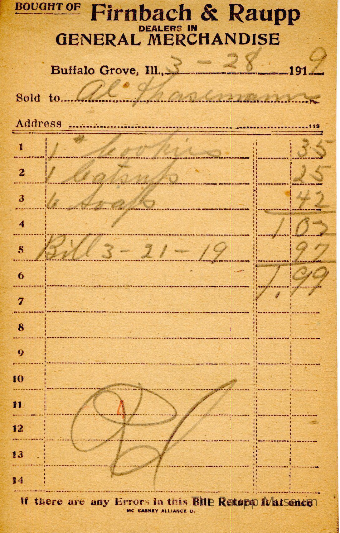The black text is as follows, from top to bottom: Bought of Firnbach & Raupp; Dealers in GENERAL MERCHANDISE; Buffalo Grove, Ill.,; Sold to; Address; If there are any errors in this bill return it at once; MC Caskey Alliance Co.Archive Details