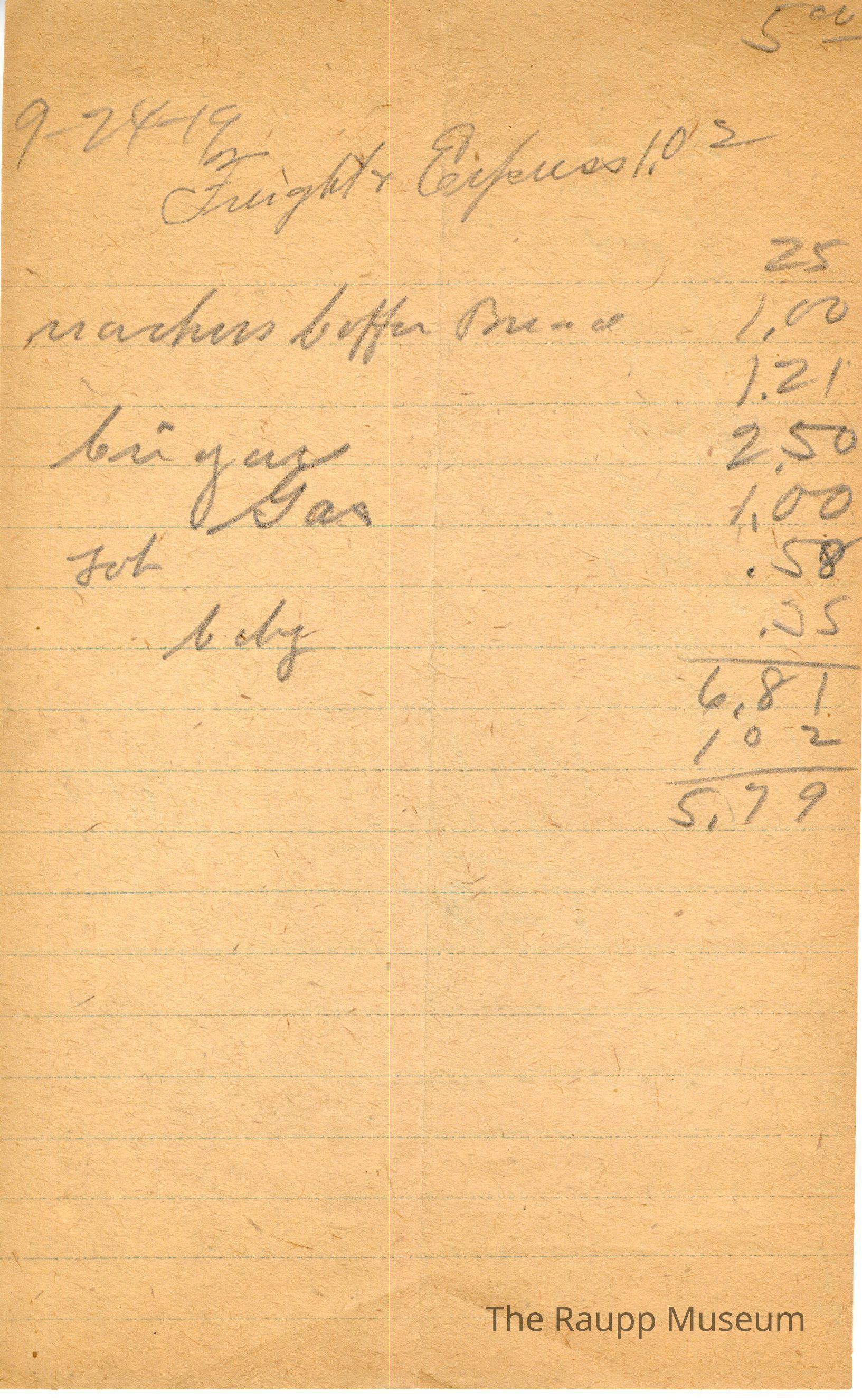 One (1) Firnbach and Raupp store receipt from September 24, 1919. Receipt is rectangular with no printed text and written notes in pencil. The receipt is for an unknown customer, who bought freight and express for $1.02, marchees coffee bread for $1.00, cigar for $2.50, gas for $1.00, tub for $0.58, and c. ehy (?) for $0.35. Upon subtracting $1.02, the bill total appears to be $5.79. There are additional prices of $5.00, $0.25, and $1.21 on the receipt.Archive Details