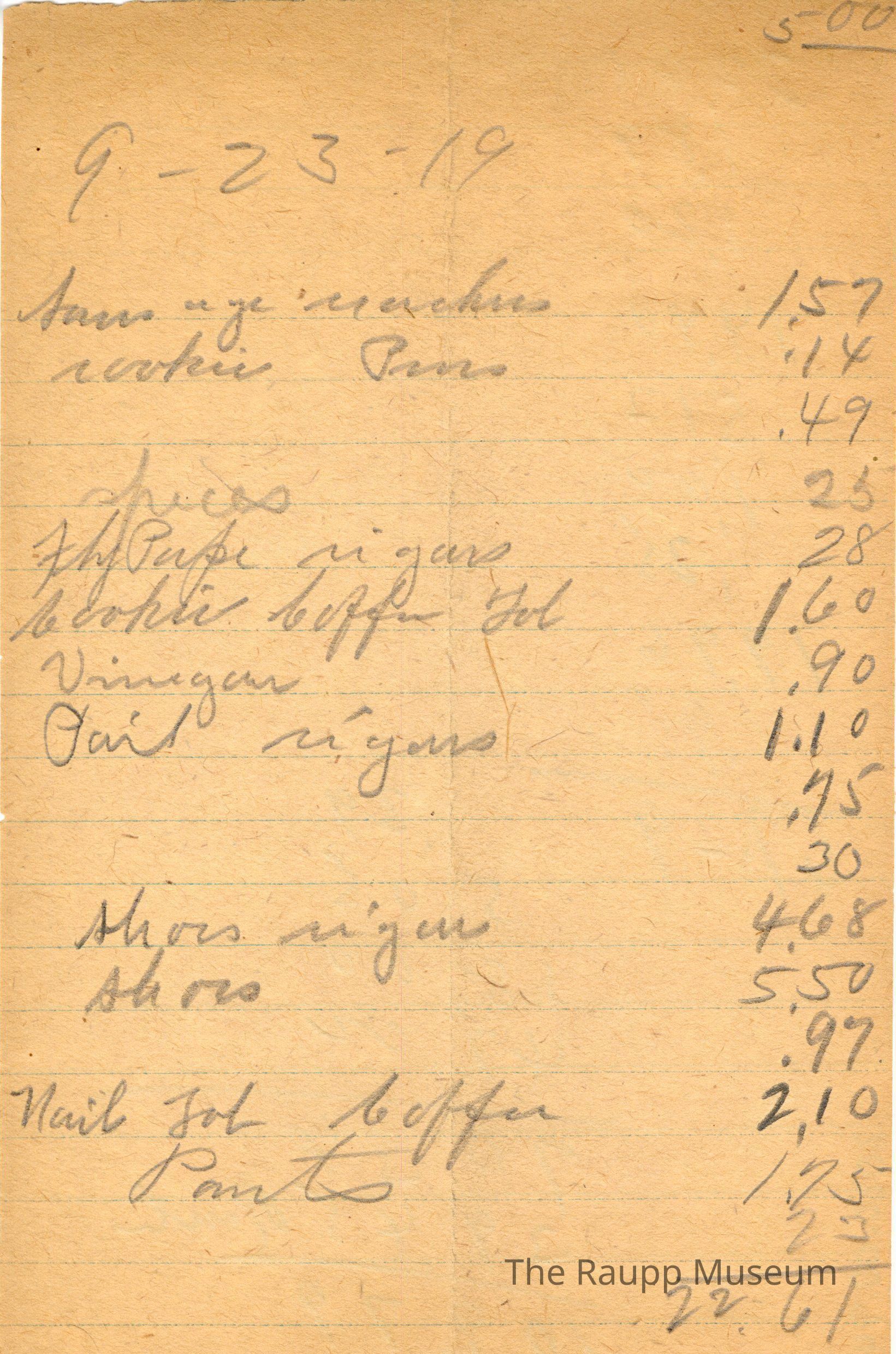 One (1) Firnbach and Raupp store receipt from September 23, 1919. Receipt is rectangular with no printed text and written notes in pencil. The receipt is for an unknown customer, who bought sausage marchees (?) for $1.57, cookie pears for $0.14, spices for $0.25, ThyPape (?) cigars for $0.28, cookie coffee tub for $1.60, vinegar for $0.90, pail cigars for $1.10, shoes cigar for $4.68, shoes for $5.50, nail tub coffee for $2.10, and pants for $1.75. The bill total appears to be $22.61. There are additional prices of $5.00, $0.49, $0.75, $0.30, $0.97, and $0.23 on the receipt.Archive Details