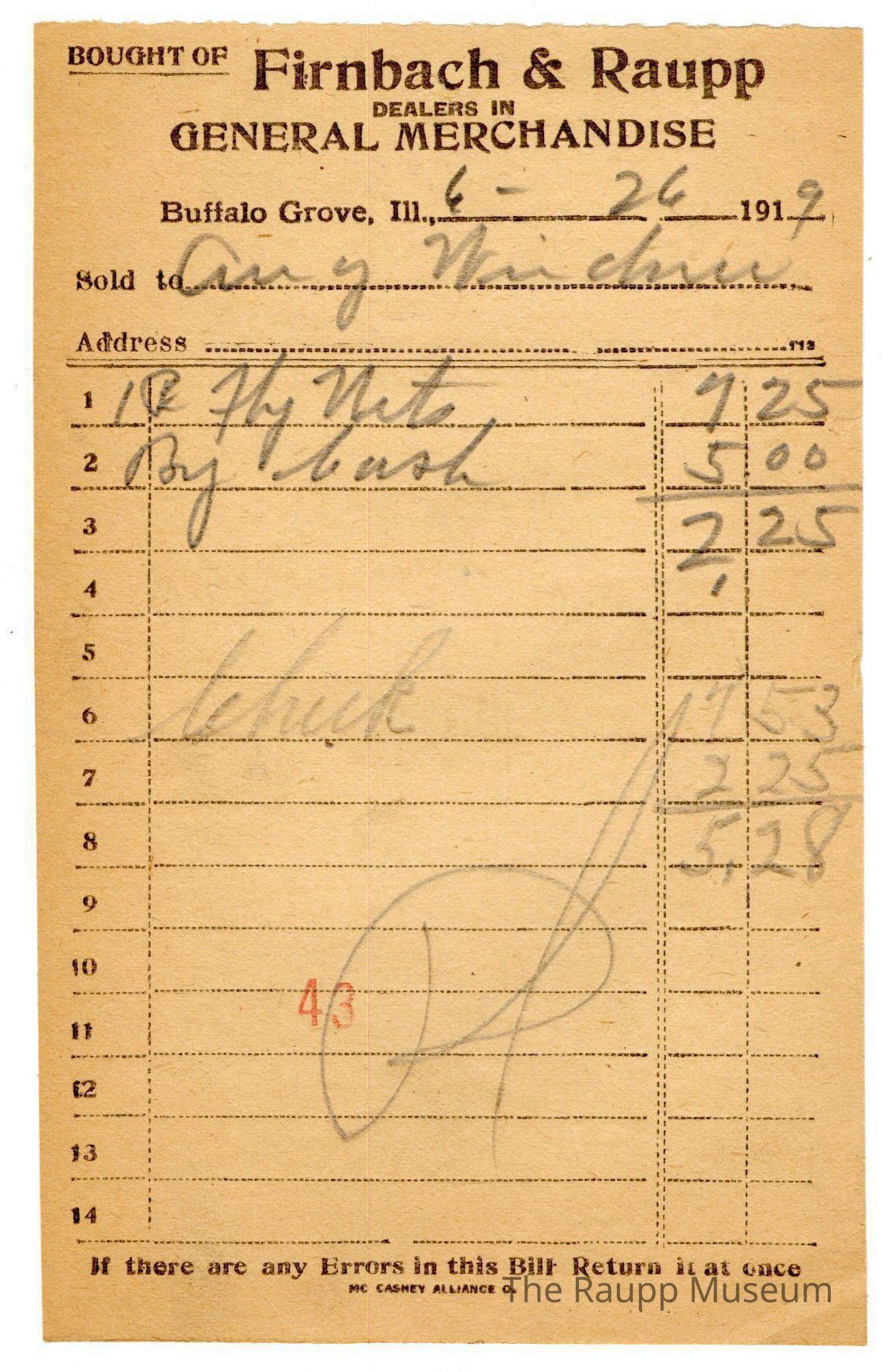One (1) Firnbach and Raupp store receipt from June 26, 1919. Receipt is rectangular with black printed text and written notes in pencil. The receipt is for Aug (August) Weinder, who bought one pk (pack) fly net for $7.25 and paid By Cash for $5.00. Bill total was $2.25. Aug Weinder received a check for $7.53; however, after the $2,25 bill was taken off the final amount received was $5.28 There's a red stamp of 43 close to the bottom, with the bill marked as paid (written as "Pd.").
