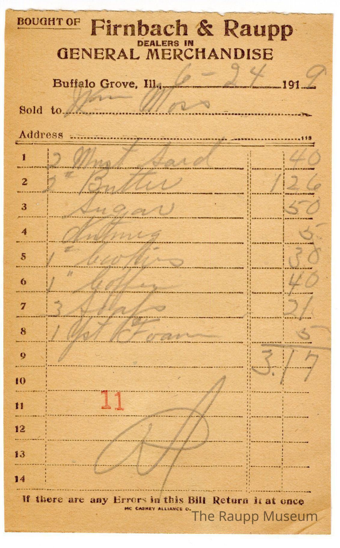 The black text is as follows, from top to bottom: Bought of Firnbach & Raupp, Dealers in GENERAL MERCHANDISE; Buffalo Grove Ill.; Sold to; Address; If there are any Errors in this Bill Return it at once; MC CASKEY ALLIANCE O.Archive Details
