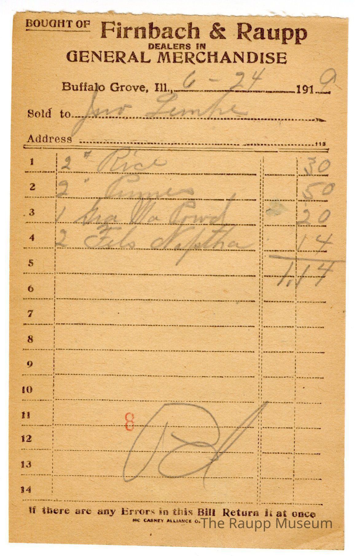 The black text is as follows, from top to bottom: Bought of Firnbach & Raupp, Dealers in GENERAL MERCHANDISE; Buffalo Grove Ill.; Sold to; Address; If there are any Errors in this Bill Return it at once; MC CASKEY ALLIANCE O.Archive Details