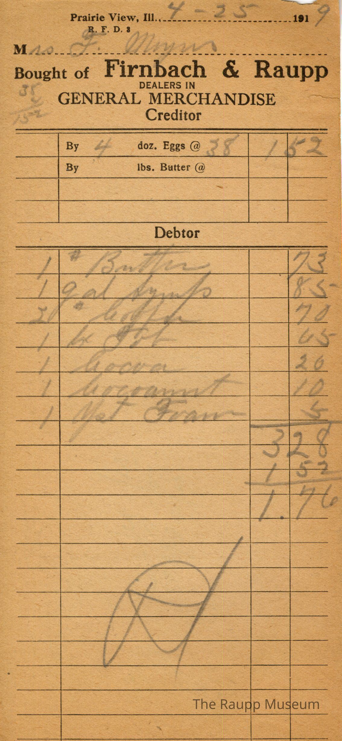 The black text is as follows, from top to bottom: Prairie View, Ill.,; Bought of Firnbach & Raupp; Dealers in GENERAL MERCHANDISE Creditor; By doz. Eggs @; By lbs Butter @; Debtor.Archive Details