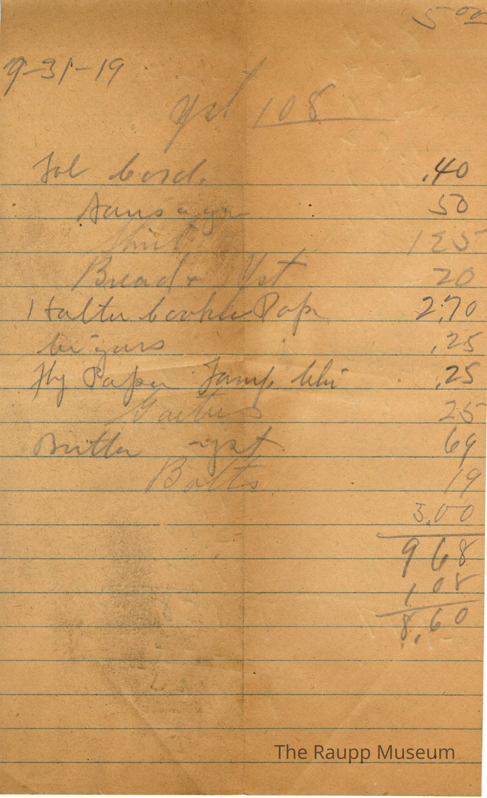One (1) Firnbach and Raupp store receipt from July 31, 1919. Receipt is rectangular on lined paper with written notes in pencil. There's a tab listed for $0.40, and the customer bought sugar(?) for $0.40, shirt for $1.25, bread yeast for $0.20, 1 (?) cookie paper for $2.70, cigars for $0.25, fly paper and lamp (?) for $0.25, garters for $0.25, butter yeast for $0.69 and bolts for $0.19. The bill total is $9.68 with $1.08 subtracted to make a total of $8.60. There is addition on the backside of the receipt.Archive Details