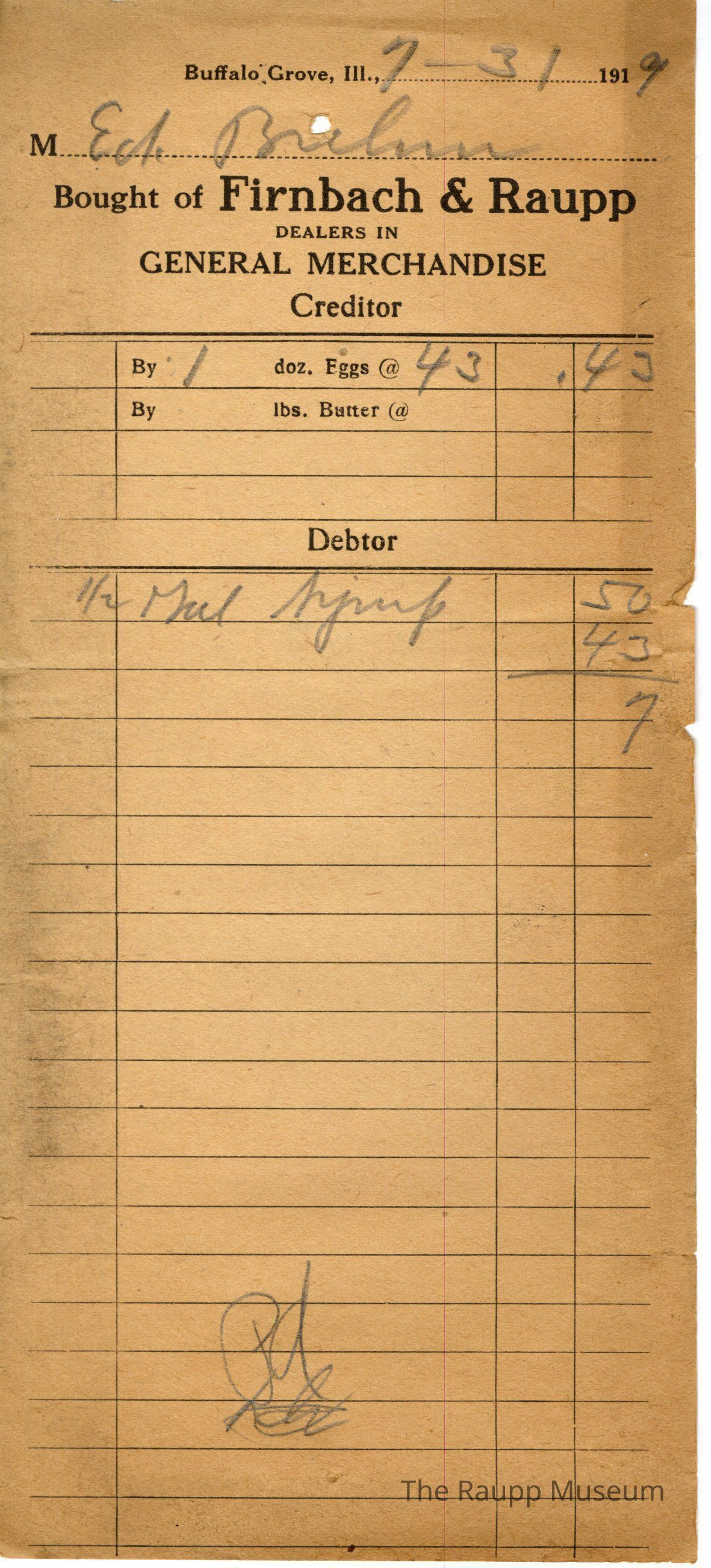 One (1) Firnbach and Raupp store receipt from July 31, 1919. Receipt is rectangular with black printed text and written notes in pencil. The receipt is for Ed Brehm, who sold 1 doz eggs for $0.43. He then bought 1/2 gal syrup for $0.50. The bill total is $0.07.