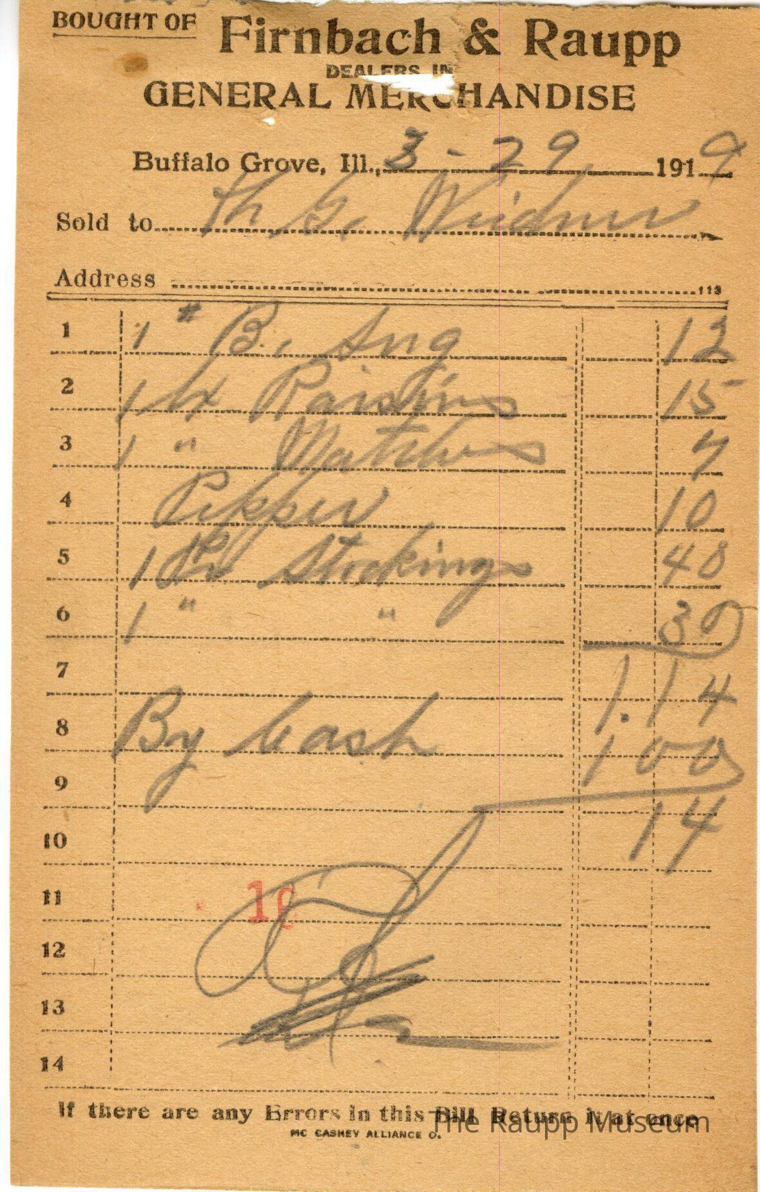 The black printed text is as follows, from top to bottom: Bought of Firnbach & Raupp; Dealers in GENERAL MERCHANDISE; Buffalo Gove. Ill, 191; Sold to; If there are any errors in this Bill Return it at once; MC CASKEY ALLIANCE O.Archive Details