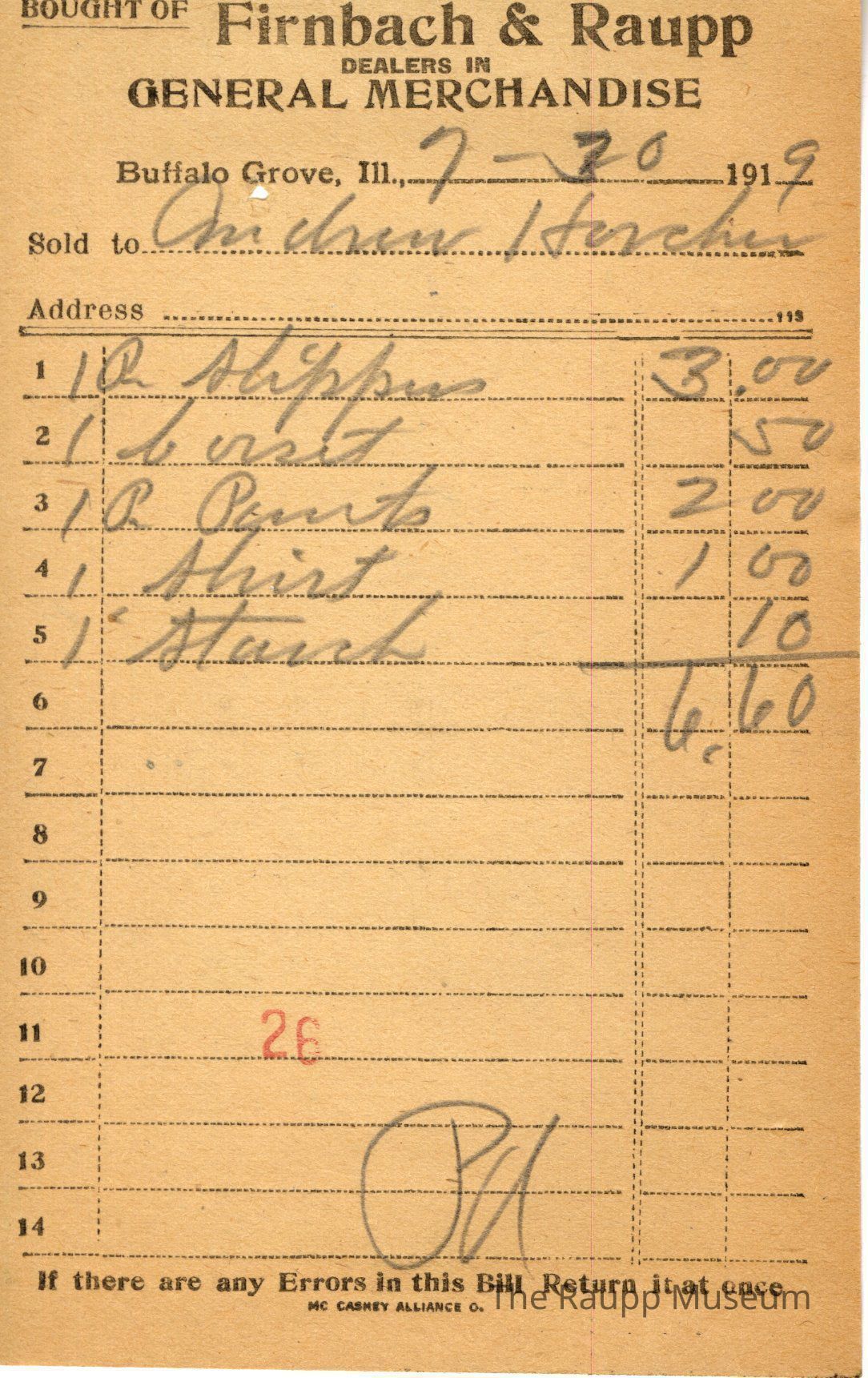 The black text is as follows, from top to bottom: Bought of Firnbach & Raupp; Dealers in GENERAL MERCHANDISE; Buffalo Grove, Ill.; Sold to; Address; if there are any Errors in this Bill Return it at once; MC CASKEY ALLIANCE O.Archive Details