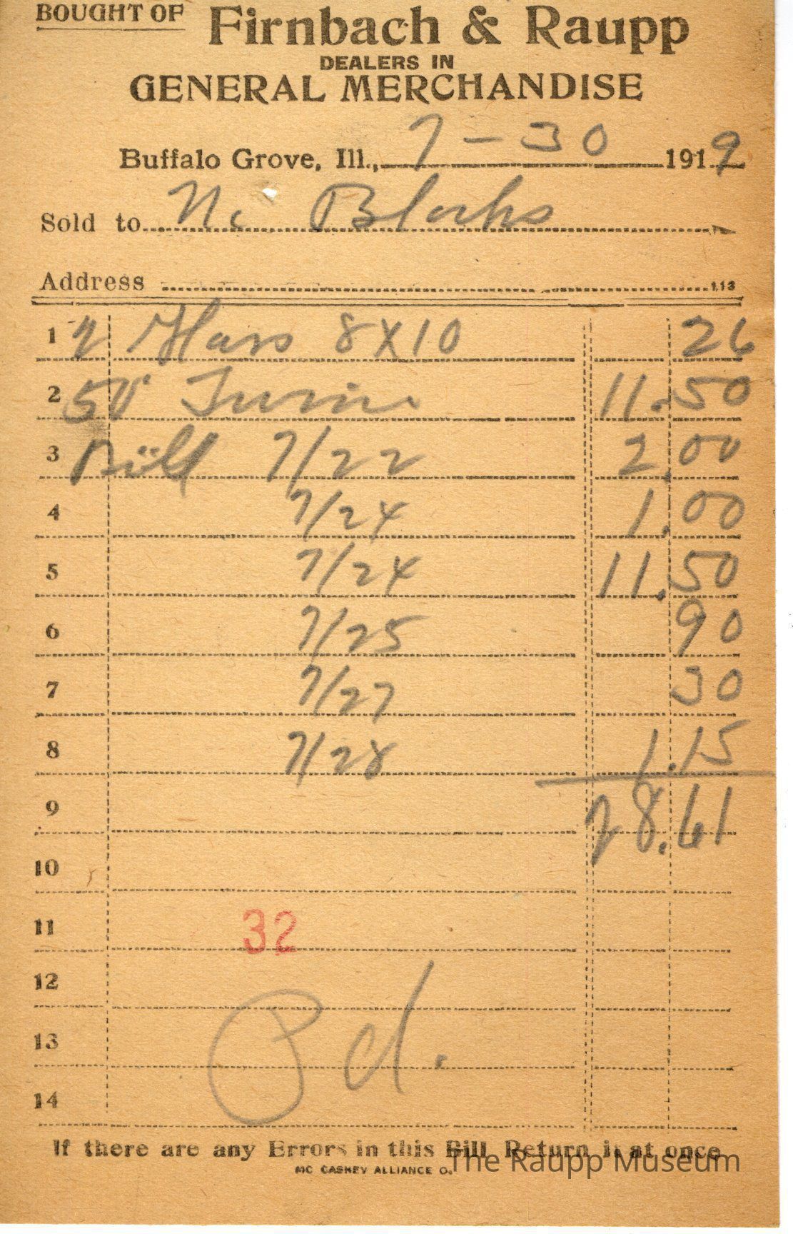 One (1) Firnbach and Raupp store receipt from July 30, 1919. Receipt is rectangular with black printed text and written notes in pencil. The receipt is for N.Blocks (?), who bought 2 glass 8x10 for $26.00 and 50 ft(?) of twine for $11.50. They paid off 6 previous tabs from July. The bill total is $28.61. There is a red stamp of "32" at the bottom with the bill, and the bill is marked as paid.