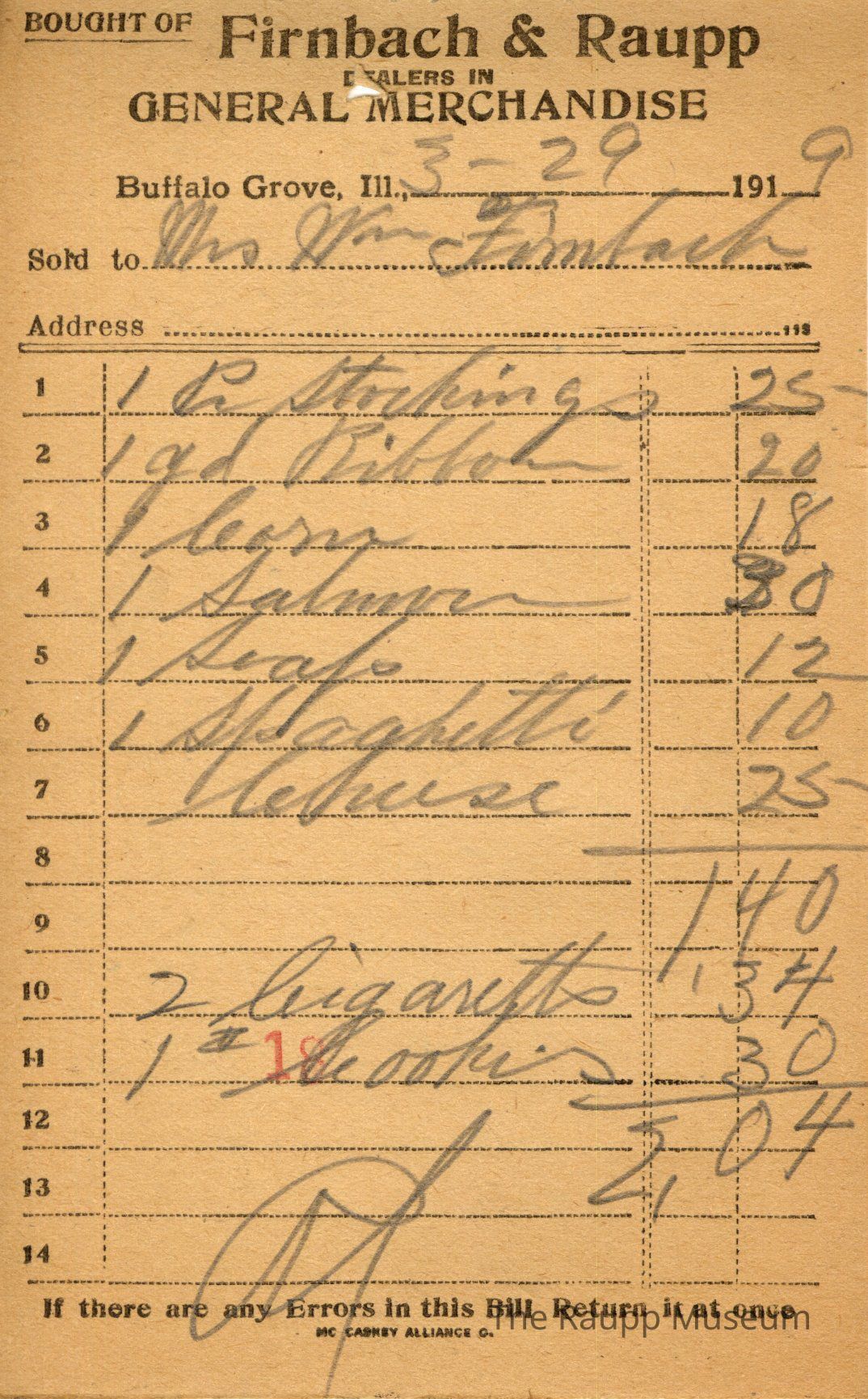 The black printed text is as follows, from top to bottom: Bought of Firnbach & Raupp; Dealers in GENERAL MERCHANDISE; Buffalo Gove. Ill, 191; Sold to; If there are any errors in this Bill Return it at once; MC CASKEY ALLIANCE O.Archive Details