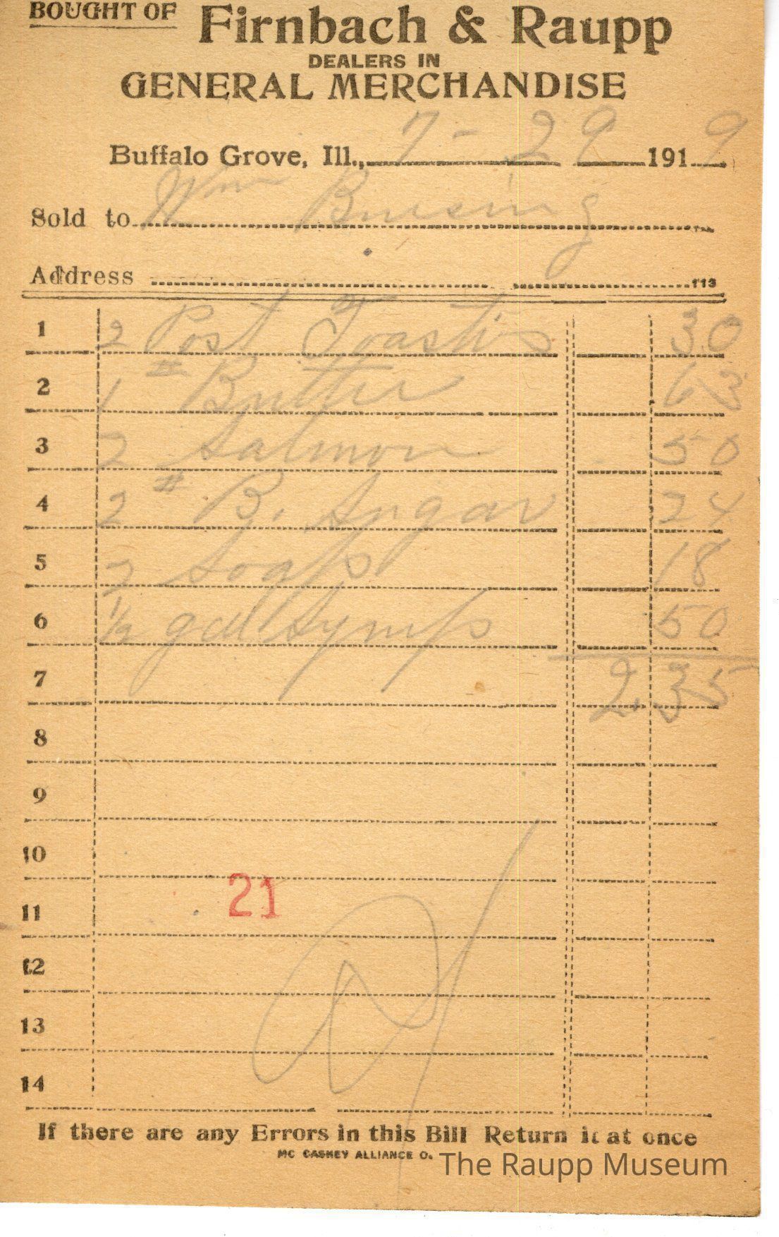 The receipt is for Wm Brusing(?) who bought 2 Post Toasties for $0.30, 1 # butter for $0.63, 2 salmon for $0.50, 2# brown sugar for $0.24, 2 soap for $0.18, and 1/2 gal syrup for $0.50. The bill total was $2.35.The bill was marked as paid, and there is a red stamp of "21" at the bottom of the receipt below the list of items.