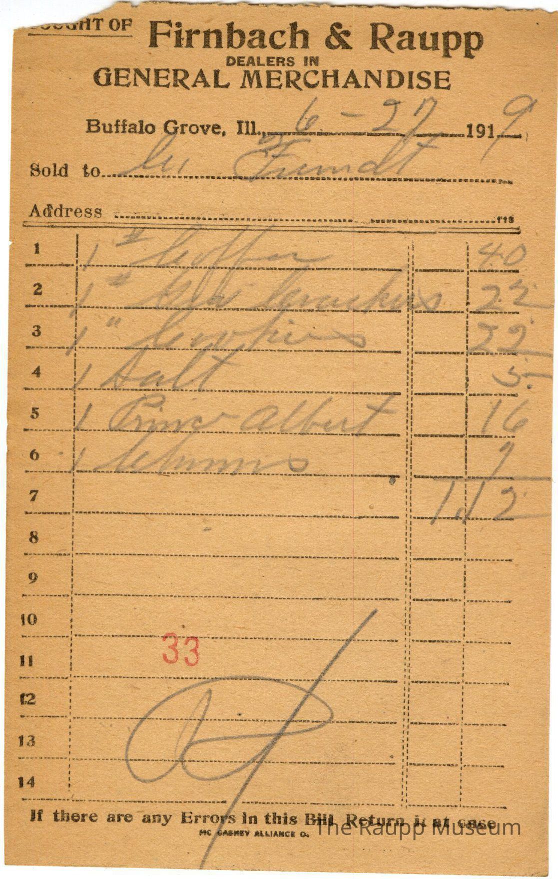 The black text is as follows, Bought of Firnbach and Raupp; Dealers in; General Merchandise; Buffalo Grove Ill.; Sold to; Address; If there are any Errors in this Bill Return it at once; MC CASKEY ALLIANCE O.