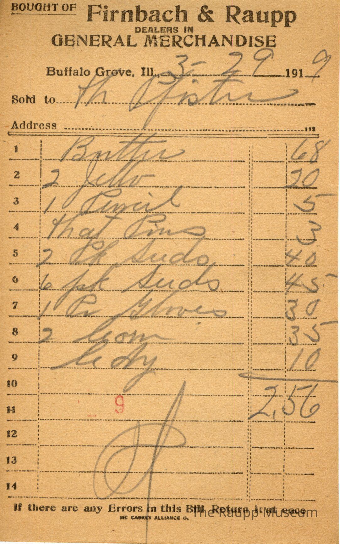 The black printed text is as follows, from top to bottom: Bought of Firnbach & Raupp; Dealers in GENERAL MERCHANDISE; Buffalo Gove. Ill, 191; Sold to; If there are any errors in this Bill Return it at once; MC CASKEY ALLIANCE O.Archive Details