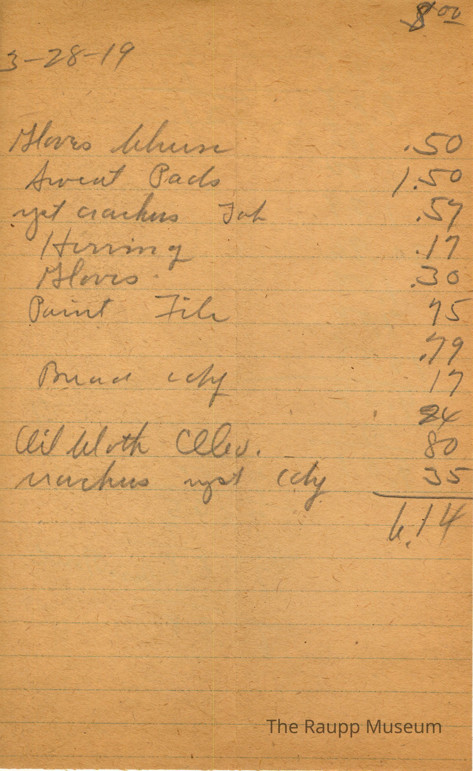 One (1) receipt from March 28, 1919. There is some blue printed ink for the lines running across the paper. The person bought gloves (?) for $0.50, sweat pads for $1.50, yeast crackers for $0.57, Herring for $0.17, gloves for $0.30, paint tiles for $0.75, $0.79, bread candy for $0.17, $0.84, oil cloth oleo for $0.84, and crackers yeast candy $0.35. Bill total is $6.14. There are also some mathematical procedures on the back.Archive Details