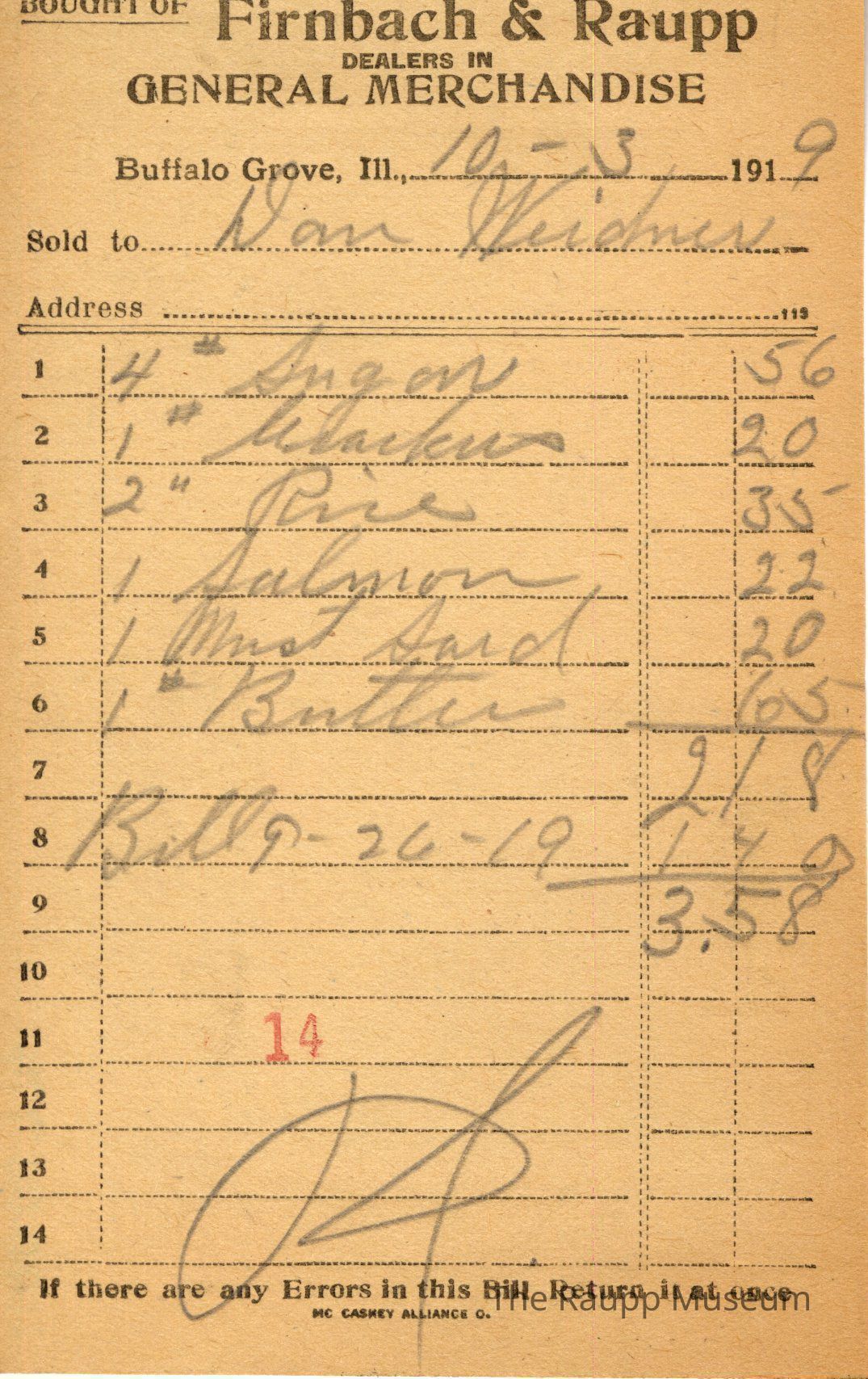 One (1) Firnbach and Raupp store receipt from October 3, 1919. Receipt is rectangular with black printed text and written notes in pencil. The receipt is for Wan Weidner, who bought four pounds of sugar for $0.56, one pound of crackers for $0.20, two pounds of rice for $0.35, one salmon for $0.22, one Must Sard for $0.20, and one pound of butter for $0.65. A previous bill of $1.40 (from 9/26/1919) was also added. The bill total is $3.58 and the receipt is marked as paid. A red stamp of 14 is located towards the bottom of the page. The text from top to bottom is: BOUGHT OF Firnbach & Raupp; DEALERS IN GENERAL MERCHANDISE; Buffalo Grove, Ill.; Sold to; Address; If there are any Errors in this Bill Return It at once; MC CASKEY ALLIANCE O.Archive Details
